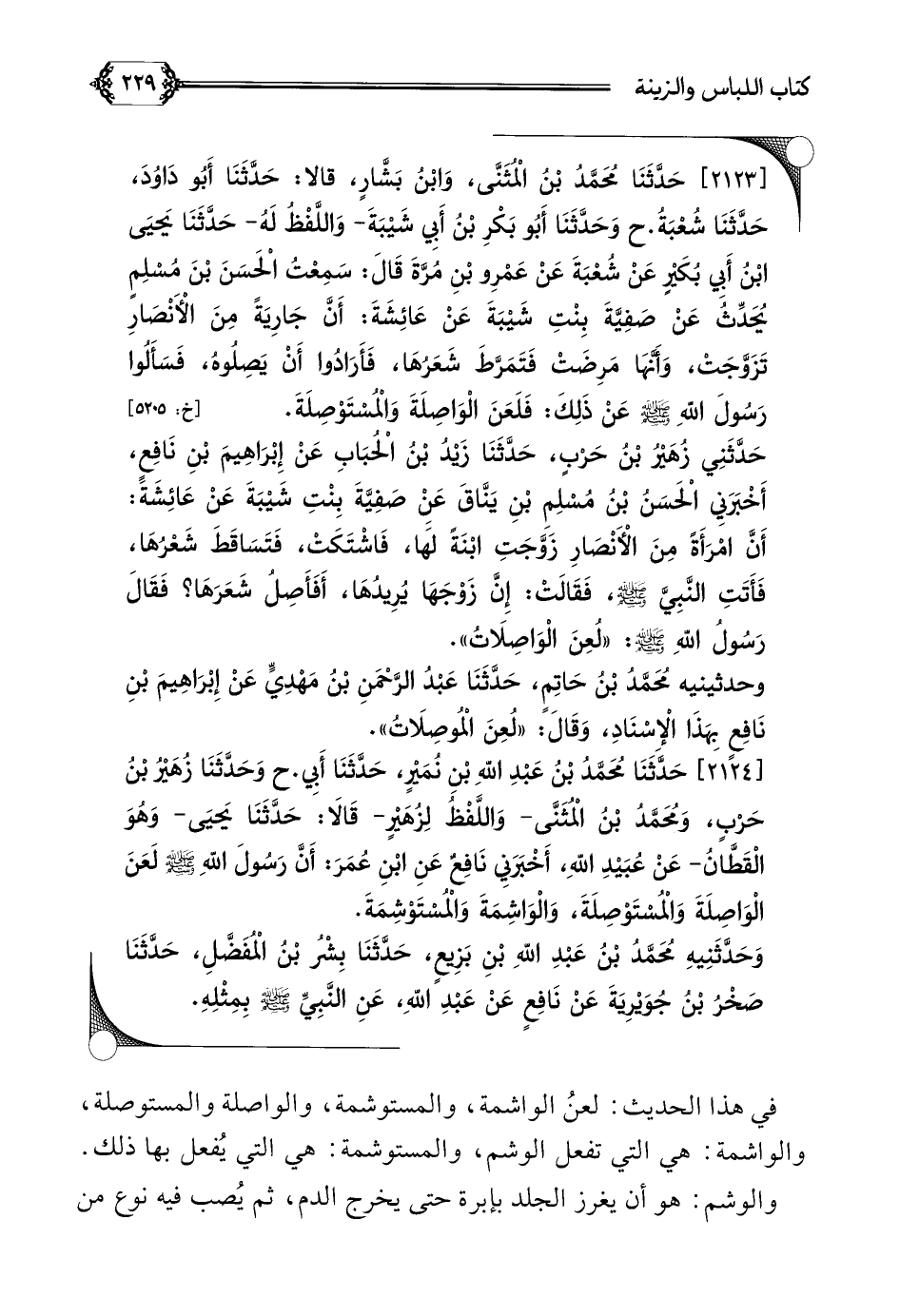 [٢١٢٤] حَدَّثَنَا مُحَمَّدُ بْنُ عَبْدِ اللَّهِ بْنِ نُمَيْرٍ، حَدَّثَنَا أَبِي. ح وَحَدَّثَنَا زُهَيْرُ بْنُ حَرْبٍ، وَمُحَمَّدُ بْنُ الْمُثَنَّى- وَاللَّفْظُ لِزُهَيْرٍ- قَالَا: حَدَّثَنَا يَحيَى- وَهُوَ الْقَطَّانُ- عَنْ عُبَيْدِ اللَّهِ، أَخْبَرَنِي نَافِعٌ عَنِ ابْنِ عُمَرَ: أَنَّ رَسُولَ اللَّهِ صلى الله عليه وسلم لَعَنَ الْوَاصِلَةَ وَالْمُسْتَوْصِلَةَ، وَالْوَاشِمَةَ وَالْمُسْتَوْشِمَةَ.