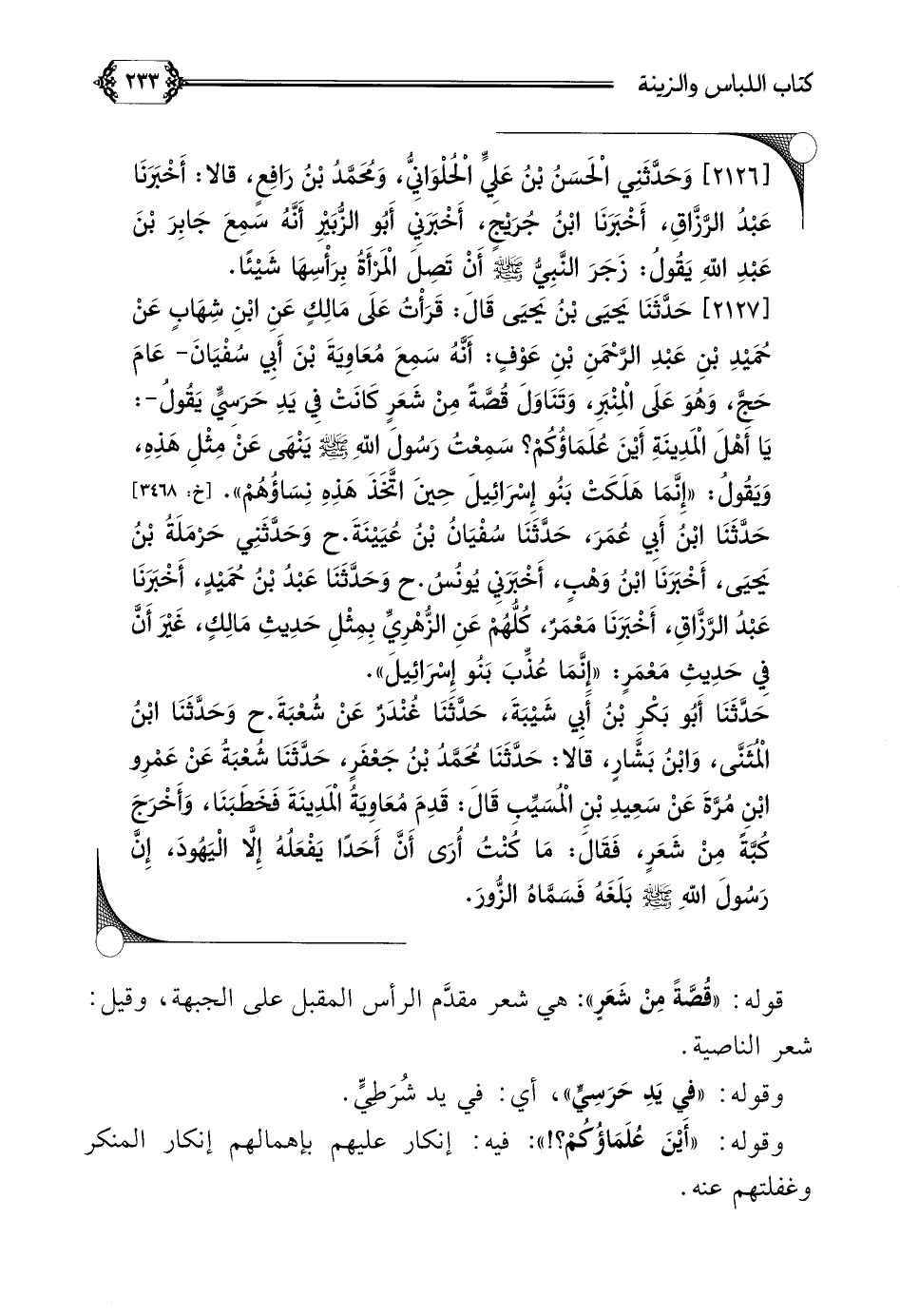 [٢١٢٧] حَدَّثَنَا يَحيَى بْنُ يَحيَى قَالَ: قَرَأْتُ عَلَى مَالِكٍ عَنِ ابْنِ شِهَابٍ عَنْ حُمَيْدِ بْنِ عَبْدِ الرَّحْمَنِ بْنِ عَوْفٍ: أَنَّهُ سَمِعَ مُعَاوِيَةَ بْنَ أَبِي سُفْيَانَ- عَامَ حَجَّ، وَهُوَ عَلَى الْمِنْبَرِ، وَتَنَاوَلَ قُصَّةً مِنْ شَعَرٍ كَانَتْ فِي يَدِ حَرَسِيٍّ يَقُولُ-: يَا أَهْلَ الْمَدِينَةِ أَيْنَ عُلَمَاؤُكُمْ؟ سَمِعْتُ رَسُولَ اللَّهِ صلى الله عليه وسلم يَنْهَى عَنْ مِثْلِ هَذِهِ، وَيَقُولُ: ((إِنَّمَا هَلَكَتْ بَنُو إِسْرَائِيلَ حِينَ اتَّخَذَ هَذِهِ نِسَاؤُهُمْ)).