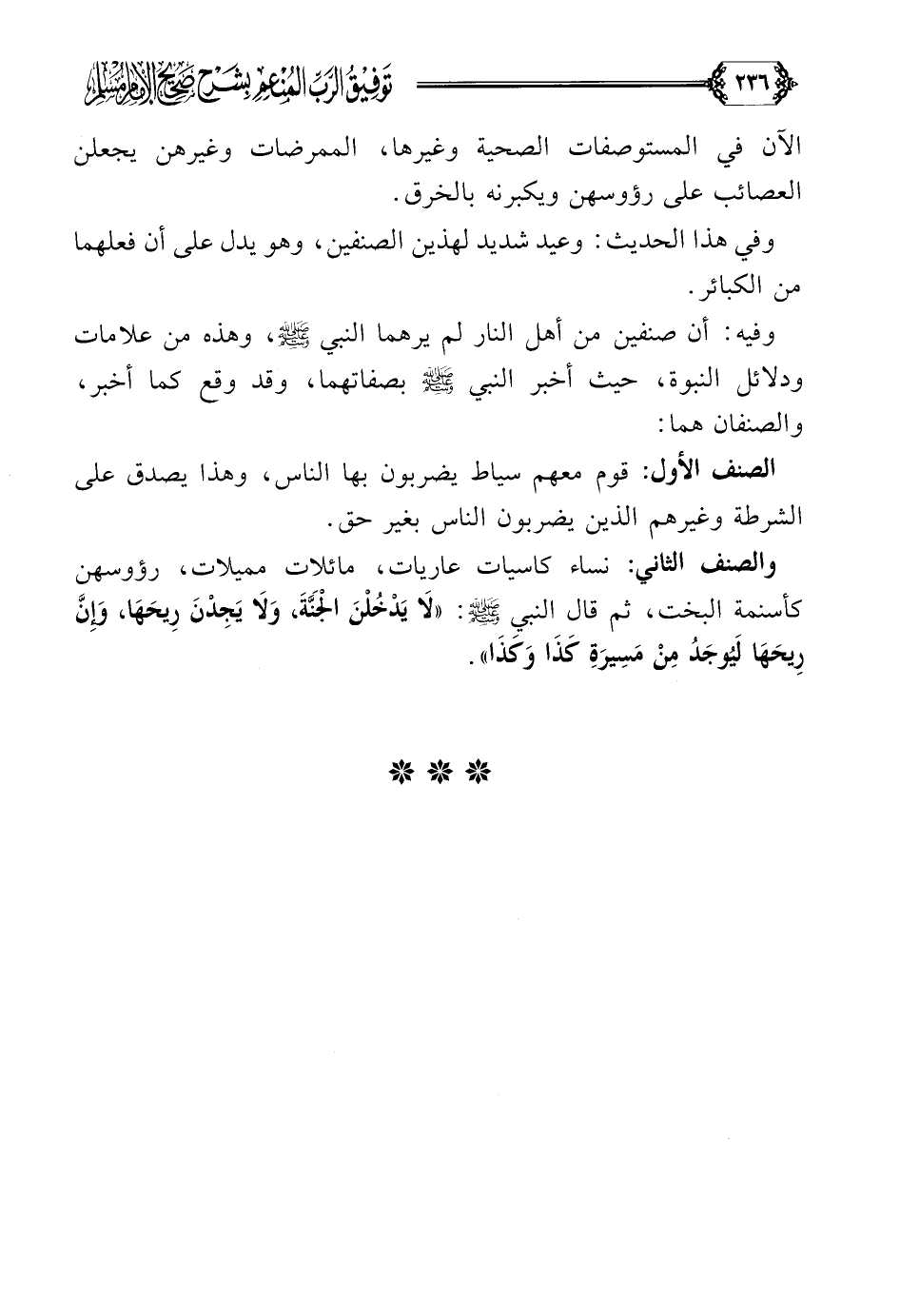 والصنف الثاني: نساء كاسيات عاريات، مائلات مميلات، رؤوسهن كأسنمة البخت، ثم قال النبي صلى الله عليه وسلم: ((لا يدخلن الجنة، ولا يجدن ريحها، وإن ريحها ليوجد من مسيرة كذا وكذا)).