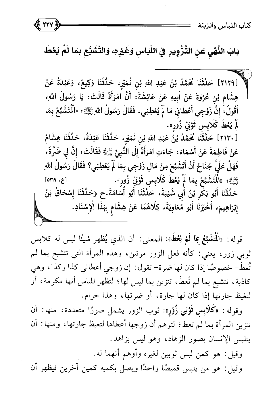 [٢١٣٠] حَدَّثَنَا مُحَمَّدُ بْنُ عَبْدِ اللَّهِ بْنِ نُمَيْرٍ، حَدَّثَنَا عَبْدَةُ، حَدَّثَنَا هِشَامٌ عَنْ فَاطِمَةَ عَنْ أَسْمَاءَ: جَاءَتِ امْرَأَةٌ إِلَى النَّبِيِّ صلى الله عليه وسلم فَقَالَتْ: إِنَّ لِي ضَرَّةً، فَهَلْ عَلَيَّ جُنَاحٌ أَنْ أَتَشَبَّعَ مِنْ مَالِ زَوْجِي بِمَا لَمْ يُعْطِنِي؟ فَقَالَ رَسُولُ اللَّهِ صلى الله عليه وسلم: ((الْمُتَشَبِّعُ بِمَا لَمْ يُعْطَ كَلَابِسِ ثَوْبَيْ زُورٍ)).
