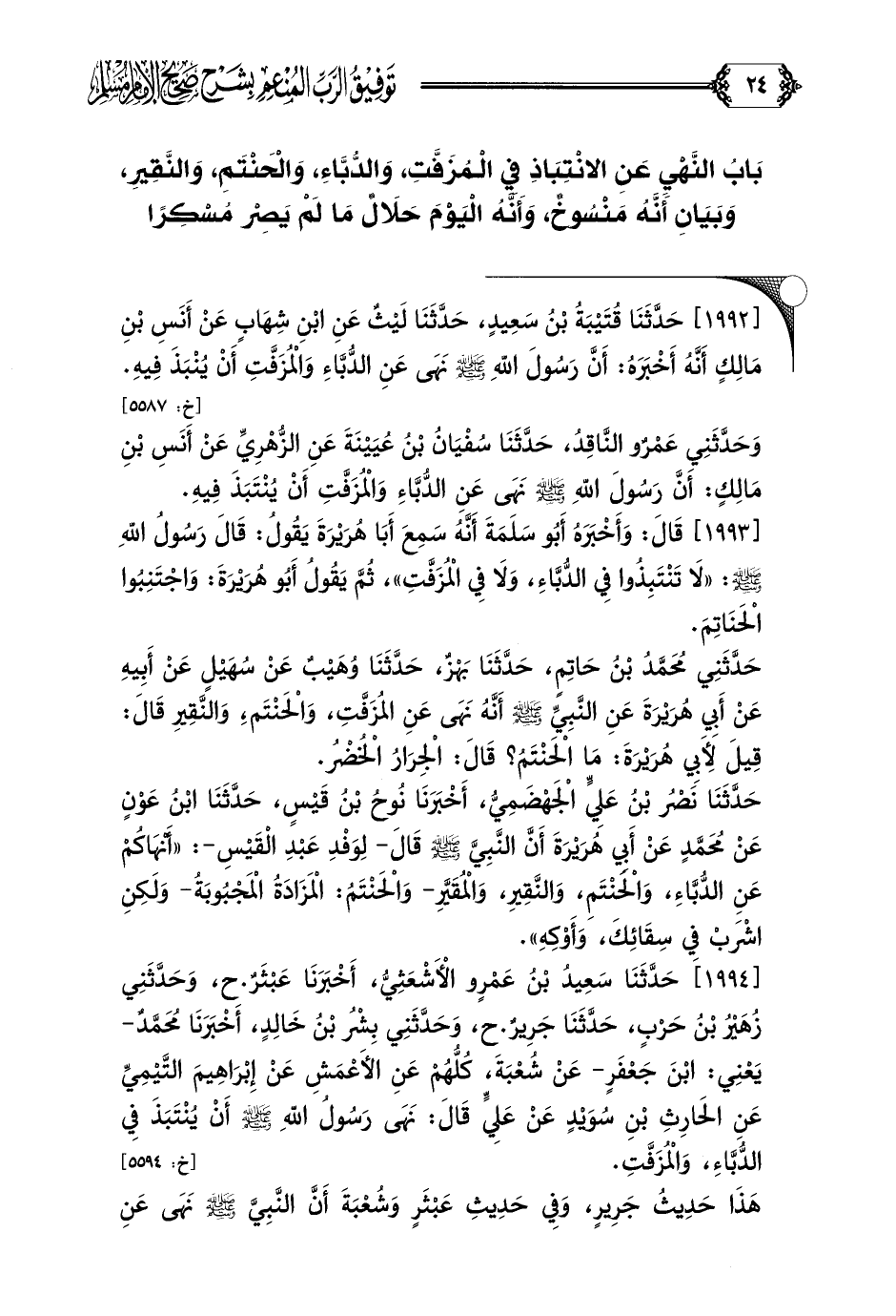 [١٩٩٣] قَالَ: وَأَخْبَرَهُ أَبُو سَلَمَةَ أَنَّهُ سَمِعَ أَبَا هُرَيْرَةَ يَقُولُ: قَالَ رَسُولُ اللَّهِ صلى الله عليه وسلم: ((لَا تَنْتَبِذُوا فِي الدُّبَّاءِ، وَلَا فِي الْمُزَفَّتِ))، ثُمَّ يَقُولُ أَبُو هُرَيْرَةَ: وَاجْتَنِبُوا الْحَنَاتِمَ.