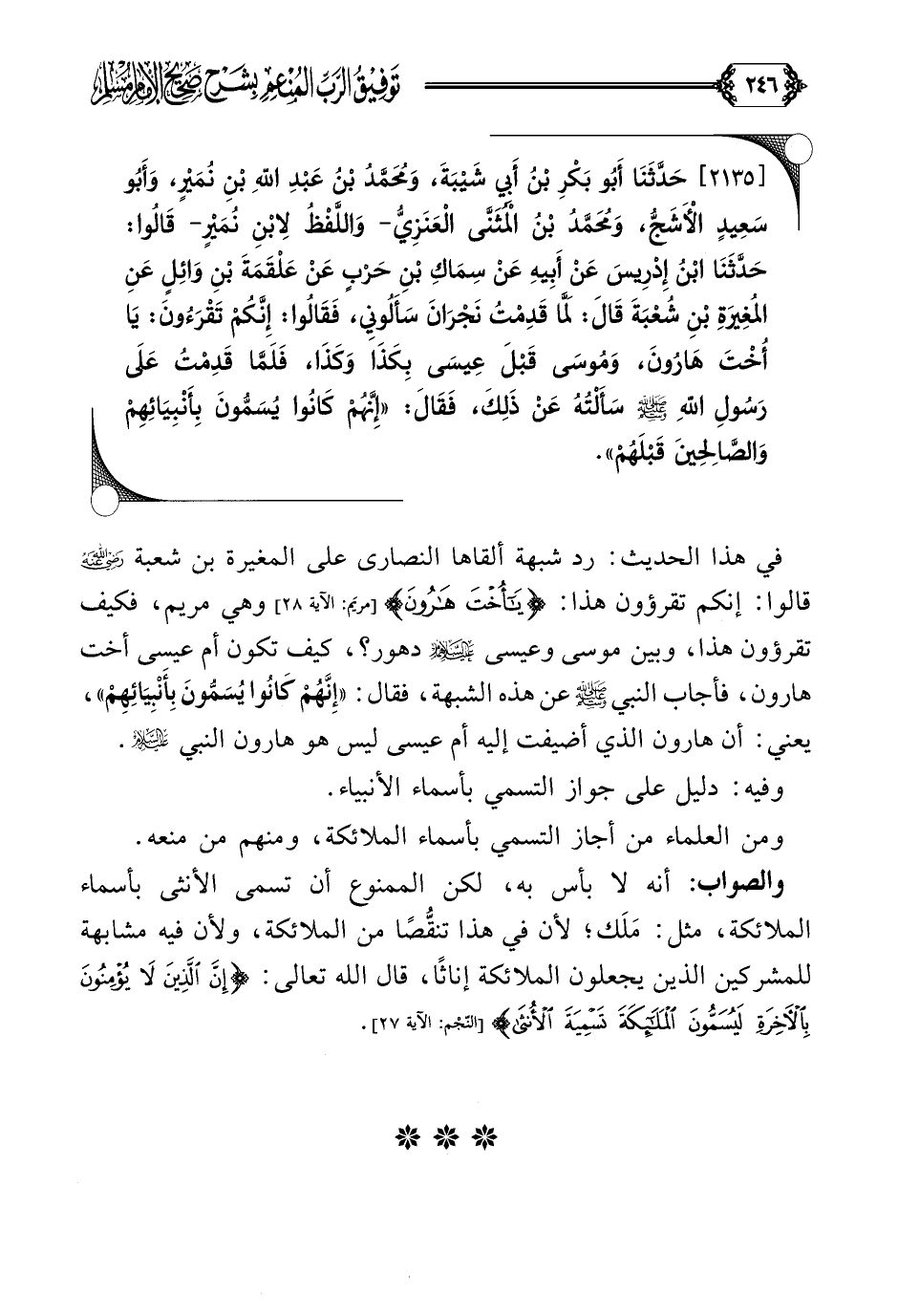 في هذا الحديث: رد شبهة ألقاها النصارى على المغيرة بن شعبة رضي الله عنه قالوا: إنكم تقرؤون هذا: {يا أخت هارون} وهي مريم، فكيف تقرؤون هذا، وبين موسى وعيسى عليهما السلام دهور؟ ، كيف تكون أم عيسى أخت هارون، فأجاب النبي صلى الله عليه وسلم عن هذه الشبهة، فقال: ((إِنَّهُمْ كَانُوا يُسَمُّونَ بِأَنْبِيَائِهِمْ))، يعني: أن هارون الذي أضيفت إليه أم عيسى ليس هو هارون النبي عليه السلام.