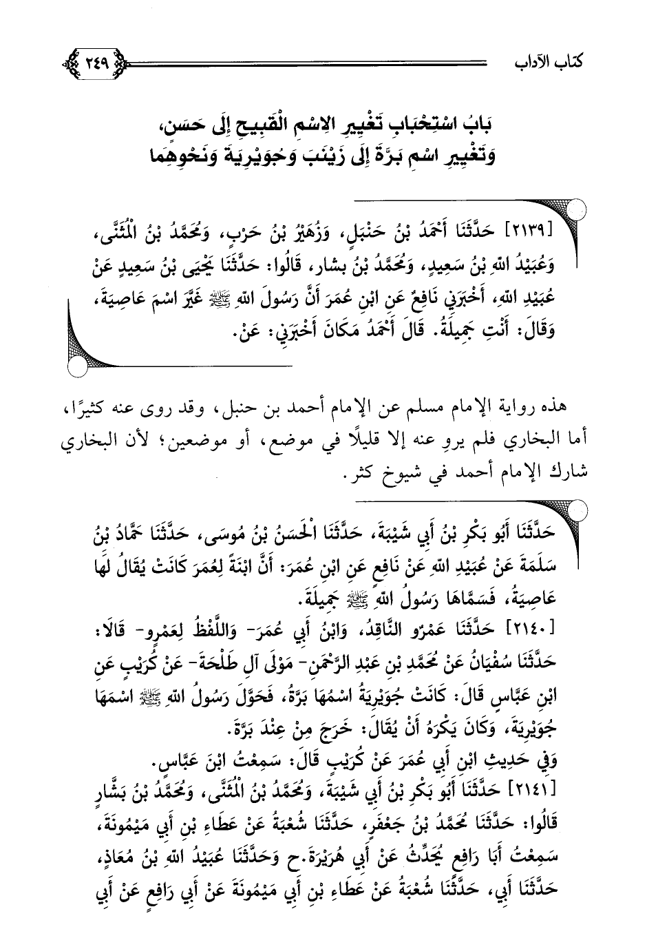 [٢١٣٩] حَدَّثَنَا أَحْمَدُ بْنُ حَنْبَلٍ، وَزُهَيْرُ بْنُ حَرْبٍ، وَمُحَمَّدُ بْنُ الْمُثَنَّى، وَعُبَيْدُ اللَّهِ بْنُ سَعِيدٍ، وَمُحَمَّدُ بْنُ بشار، قَالُوا: حَدَّثَنَا يَحْيَى بْنُ سَعِيدٍ عَنْ عُبَيْدِ اللَّهِ، أَخْبَرَنِي نَافِعٌ عَنِ ابْنِ عُمَرَ أَنَّ رَسُولَ اللَّهِ صلى الله عليه وسلم غَيَّرَ اسْمَ عَاصِيَةَ، وَقَالَ: أَنْتِ جَمِيلَةُ. قَالَ أَحْمَدُ مَكَانَ أَخْبَرَنِي: عَنْ.