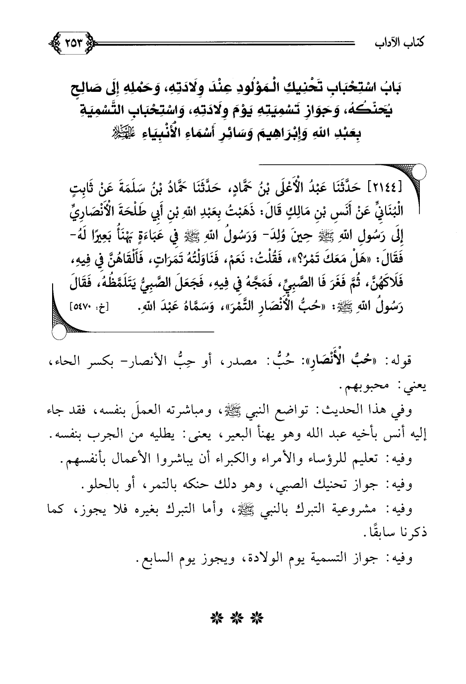[٢١٤٤] حَدَّثَنَا عَبْدُ الْأَعْلَى بْنُ حَمَّادٍ، حَدَّثَنَا حَمَّادُ بْنُ سَلَمَةَ عَنْ ثَابِتٍ الْبُنَانِيِّ عَنْ أَنَسِ بْنِ مَالِكٍ قَالَ: ذَهَبْتُ بِعَبْدِ اللَّهِ بْنِ أَبِي طَلْحَةَ الْأَنْصَارِيِّ إِلَى رَسُولِ اللَّهِ صلى الله عليه وسلم حِينَ وُلِدَ- وَرَسُولُ اللَّهِ صلى الله عليه وسلم فِي عَبَاءَةٍ يَهْنَأُ بَعِيرًا لَهُ- فَقَالَ: ((هَلْ مَعَكَ تَمْرٌ؟ ))، فَقُلْتُ: نَعَمْ، فَنَاوَلْتُهُ تَمَرَاتٍ، فَأَلْقَاهُنَّ فِي فِيهِ، فَلَاكَهُنَّ، ثُمَّ فَغَرَ فَا الصَّبِيِّ، فَمَجَّهُ فِي فِيهِ، فَجَعَلَ الصَّبِيُّ يَتَلَمَّظُهُ، فَقَالَ رَسُولُ اللَّهِ صلى الله عليه وسلم: ((حُبُّ الْأَنْصَارِ التَّمْرَ))، وَسَمَّاهُ عَبْدَ اللَّهِ.