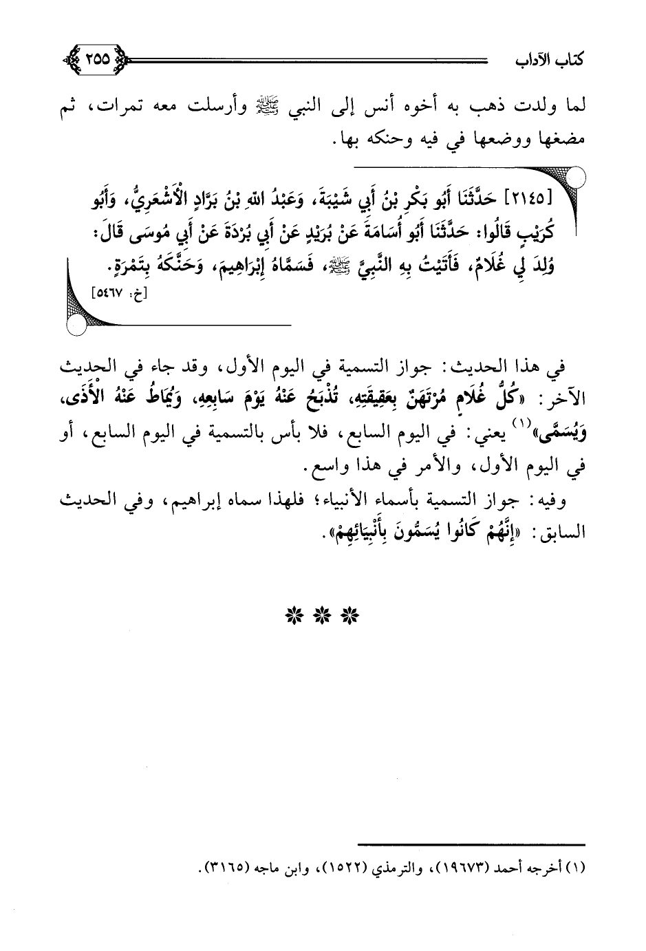 [٢١٤٥] حَدَّثَنَا أَبُو بَكْرِ بْنُ أَبِي شَيْبَةَ، وَعَبْدُ اللَّهِ بْنُ بَرَّادٍ الْأَشْعَرِيُّ، وَأَبُو كُرَيْبٍ قَالُوا: حَدَّثَنَا أَبُو أُسَامَةَ عَنْ بُرَيْدٍ عَنْ أَبِي بُرْدَةَ عَنْ أَبِي مُوسَى قَالَ: وُلِدَ لِي غُلَامٌ، فَأَتَيْتُ بِهِ النَّبِيَّ صلى الله عليه وسلم، فَسَمَّاهُ إِبْرَاهِيمَ، وَحَنَّكَهُ بِتَمْرَةٍ.