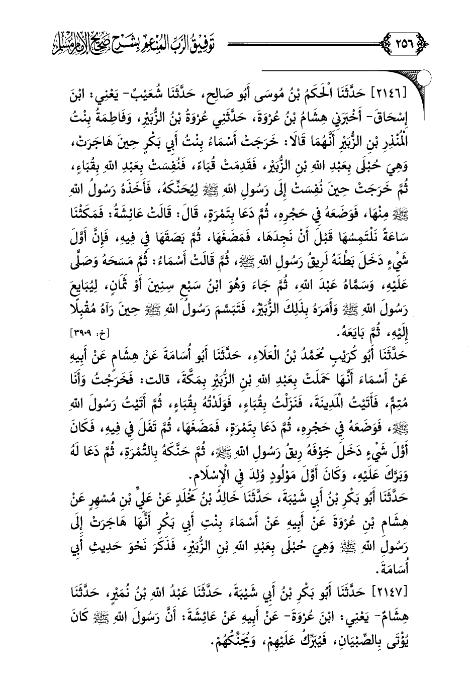 [٢١٤٦] حَدَّثَنَا الْحَكَمُ بْنُ مُوسَى أَبُو صَالِح، حَدَّثَنَا شُعَيْبٌ- يَعْنِي: ابْنَ إِسْحَاقَ- أَخْبَرَنِي هِشَامُ بْنُ عُرْوَةَ، حَدَّثَنِي عُرْوَةُ بْنُ الزُّبَيْرِ، وَفَاطِمَةُ بِنْتُ الْمُنْذِرِ بْنِ الزُّبَيْرِ أَنَّهُمَا قَالَا: خَرَجَتْ أَسْمَاءُ بِنْتُ أَبِي بَكْرٍ حِينَ هَاجَرَتْ، وَهِيَ حُبْلَى بِعَبْدِ اللَّهِ بْنِ الزُّبَيْر، فَقَدِمَتْ قُبَاءً، فَنُفِسَتْ بِعَبْدِ اللَّهِ بِقُبَاءٍ، ثُمَّ خَرَجَتْ حِينَ نُفِسَتْ إِلَى رَسُولِ اللَّهِ صلى الله عليه وسلم لِيُحَنِّكَهُ، فَأَخَذَهُ رَسُولُ اللَّهِ صلى الله عليه وسلم مِنْهَا، فَوَضَعَهُ فِي حَجْرِهِ، ثُمَّ دَعَا بِتَمْرَةٍ، قَالَ: قَالَتْ عَائِشَةُ: فَمَكَثْنَا سَاعَةً نَلْتَمِسُهَا قَبْلَ أَنْ نَجِدَهَا، فَمَضَغَهَا، ثُمَّ بَصَقَهَا فِي فِيهِ، فَإِنَّ أَوَّلَ شَيْءٍ دَخَلَ بَطْنَهُ لَرِيقُ رَسُولِ اللَّهِ صلى الله عليه وسلم، ثُمَّ قَالَتْ أَسْمَاءُ: ثُمَّ مَسَحَهُ وَصَلَّى عَلَيْهِ، وَسَمَّاهُ عَبْدَ اللَّهِ، ثُمَّ جَاءَ وَهُوَ ابْنُ سَبْعِ سِنِينَ أَوْ ثَمَانٍ، لِيُبَايِعَ رَسُولَ اللَّهِ صلى الله عليه وسلم وَأَمَرَهُ بِذَلِكَ الزُّبَيْرُ، فَتَبَسَّمَ رَسُولُ اللَّهِ صلى الله عليه وسلم حِينَ رَآهُ مُقْبِلًا إِلَيْهِ، ثُمَّ بَايَعَهُ.