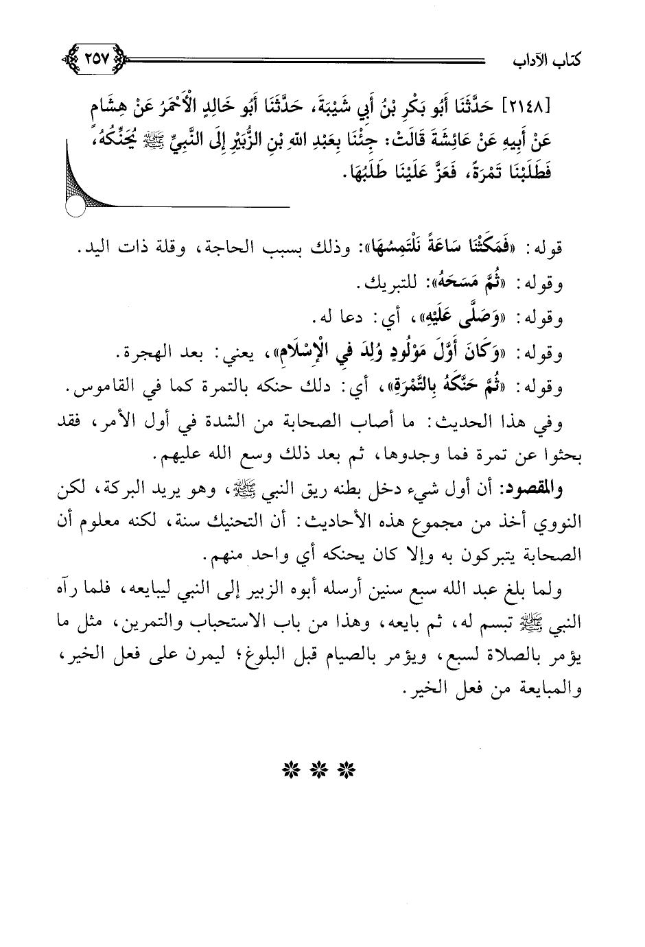 [٢١٤٨] حَدَّثَنَا أَبُو بَكْرِ بْنُ أَبِي شَيْبَةَ، حَدَّثَنَا أَبُو خَالِدٍ الْأَحْمَرُ عَنْ هِشَامٍ عَنْ أَبِيهِ عَنْ عَائِشَةَ قَالَتْ: جِئْنَا بِعَبْدِ اللَّهِ بْنِ الزُّبَيْرِ إِلَى النَّبِيِّ صلى الله عليه وسلم يُحَنِّكُهُ، فَطَلَبْنَا تَمْرَةً، فَعَزَّ عَلَيْنَا طَلَبُهَا.