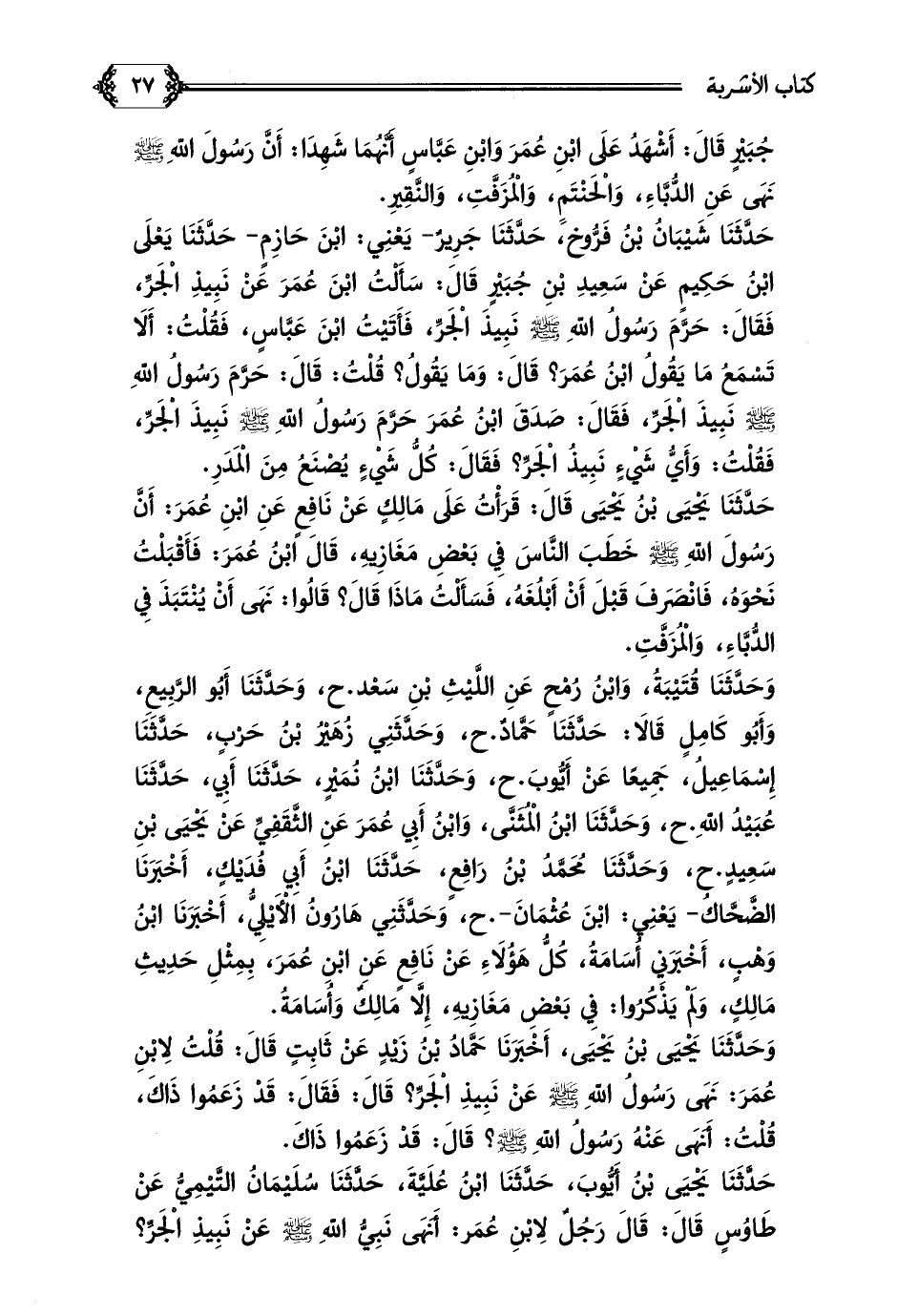 جُبَيْرٍ قَالَ: أَشْهَدُ عَلَى ابْنِ عُمَرَ وَابْنِ عَبَّاسٍ أَنَّهُمَا شَهِدَا: أَنَّ رَسُولَ اللَّهِ صلى الله عليه وسلم نَهَى عَنِ الدُّبَّاءِ، وَالْحَنْتَمِ، وَالْمُزَفَّتِ، وَالنَّقِيرِ.