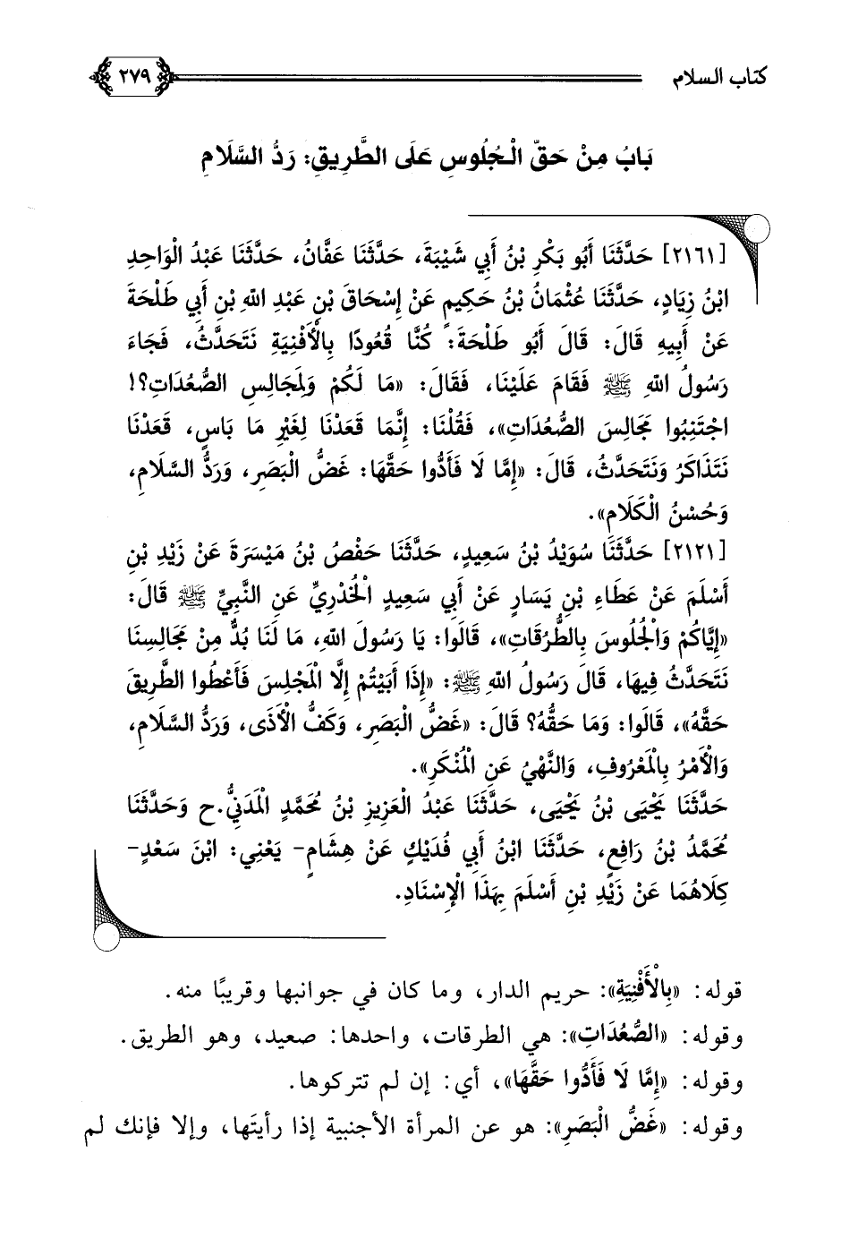 [٢١٢١] حَدَّثَنَا سُوَيْدُ بْنُ سَعِيدٍ، حَدَّثَنَا حَفْصُ بْنُ مَيْسَرَةَ عَنْ زَيْدِ بْنِ أَسْلَمَ عَنْ عَطَاءِ بْنِ يَسَارٍ عَنْ أَبِي سَعِيدٍ الْخُدْرِيِّ عَنِ النَّبِيِّ صلى الله عليه وسلم قَالَ: ((إِيَّاكُمْ وَالْجُلُوسَ بِالطُّرُقَاتِ))، قَالَوا: يَا رَسُولَ اللهِ، مَا لَنَا بُدٌّ مِنْ مَجَالِسِنَا نَتَحَدَّثُ فِيهَا، قَالَ رَسُولُ اللهِ صلى الله عليه وسلم: ((إِذَا أَبَيْتُمْ إِلَّا الْمَجْلِسَ فَأَعْطُوا الطَّرِيقَ حَقَّهُ))، قَالَوا: وَمَا حَقُّهُ؟ قَالَ: ((غَضُّ الْبَصَرِ، وَكَفُّ الْأَذَى، وَرَدُّ السَّلَامِ، وَالْأَمْرُ بِالْمَعْرُوفِ، وَالنَّهْيُ عَنِ الْمُنْكَرِ)).