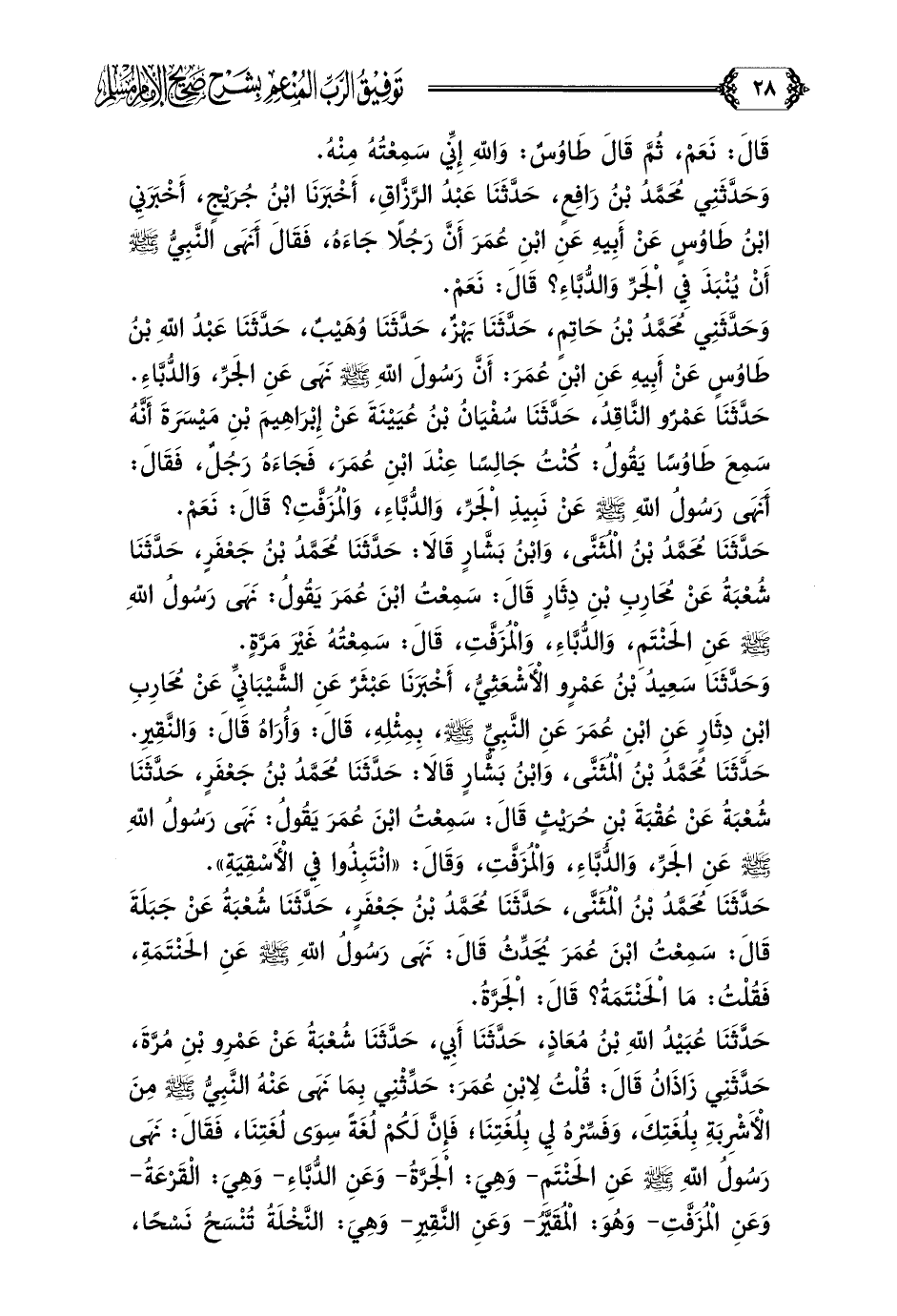 حَدَّثَنَا عُبَيْدُ اللَّهِ بْنُ مُعَاذٍ، حَدَّثَنَا أَبِي، حَدَّثَنَا شُعْبَةُ عَنْ عَمْرِو بْنِ مُرَّةَ، حَدَّثَنِي زَاذَانُ قَالَ: قُلْتُ لِابْنِ عُمَرَ: حَدِّثْنِي بِمَا نَهَى عَنْهُ النَّبِيُّ صلى الله عليه وسلم مِنَ الْأَشْرِبَةِ بِلُغَتِكَ، وَفَسِّرْهُ لِي بِلُغَتِنَا؛ فَإِنَّ لَكُمْ لُغَةً سِوَى لُغَتِنَا، فَقَالَ: نَهَى رَسُولُ اللَّهِ صلى الله عليه وسلم عَنِ الحَنْتَمِ- وَهِيَ: الْجَرَّةُ- وَعَنِ الدُّبَّاءِ- وَهِيَ: الْقَرْعَةُ- وَعَنِ الْمُزَفَّتِ- وَهُوَ: الْمُقَيَّرُ- وَعَنِ النَّقِيرِ- وَهِيَ: النَّخْلَةُ تُنْسَحُ نَسْحًا،