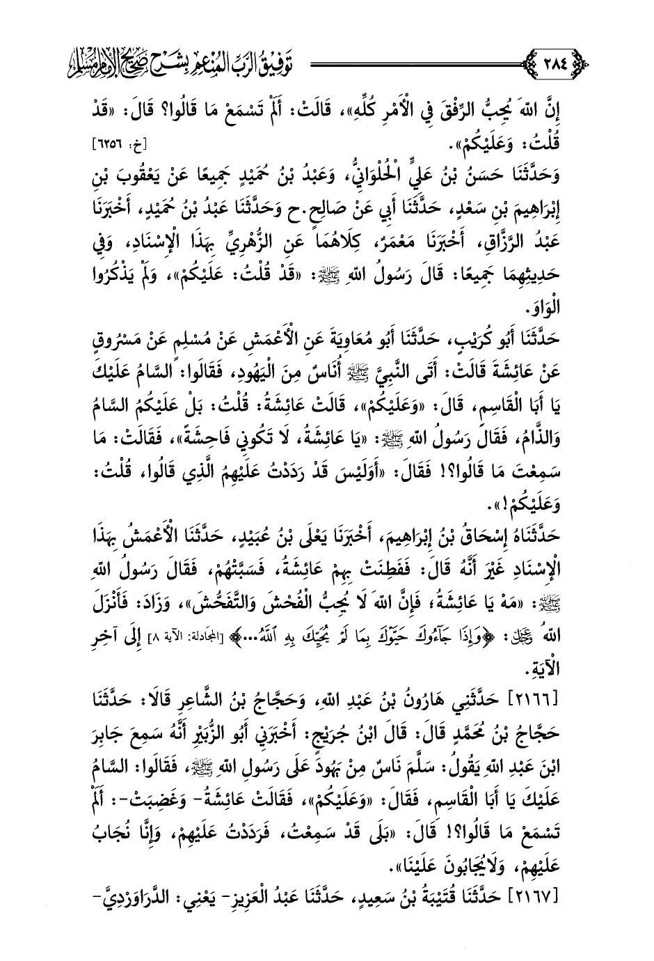 حَدَّثَنَا أَبُو كُرَيْبٍ، حَدَّثَنَا أَبُو مُعَاوِيَةَ عَنِ الْأَعْمَشِ عَنْ مُسْلِمٍ عَنْ مَسْرُوقٍ عَنْ عَائِشَةَ قَالَتْ: أَتَى النَّبِيَّ صلى الله عليه وسلم أُنَاسٌ مِنْ الْيَهُودِ، فَقَالَوا: السَّامُ عَلَيْكَ يَا أَبَا الْقَاسِمِ، قَالَ: ((وَعَلَيْكُمْ))، قَالَتْ عَائِشَةُ: قُلْتُ: بَلْ عَلَيْكُمُ السَّامُ وَالذَّامُ، فَقَالَ رَسُولُ اللهِ صلى الله عليه وسلم: ((يَا عَائِشَةُ، لَا تَكُونِي فَاحِشَةً))، فَقَالَتْ: مَا سَمِعْتَ مَا قَالُوا؟ ! فَقَالَ: ((أَوَلَيْسَ قَدْ رَدَدْتُ عَلَيْهِمُ الَّذِي قَالُوا، قُلْتُ: وَعَلَيْكُمْ! )).