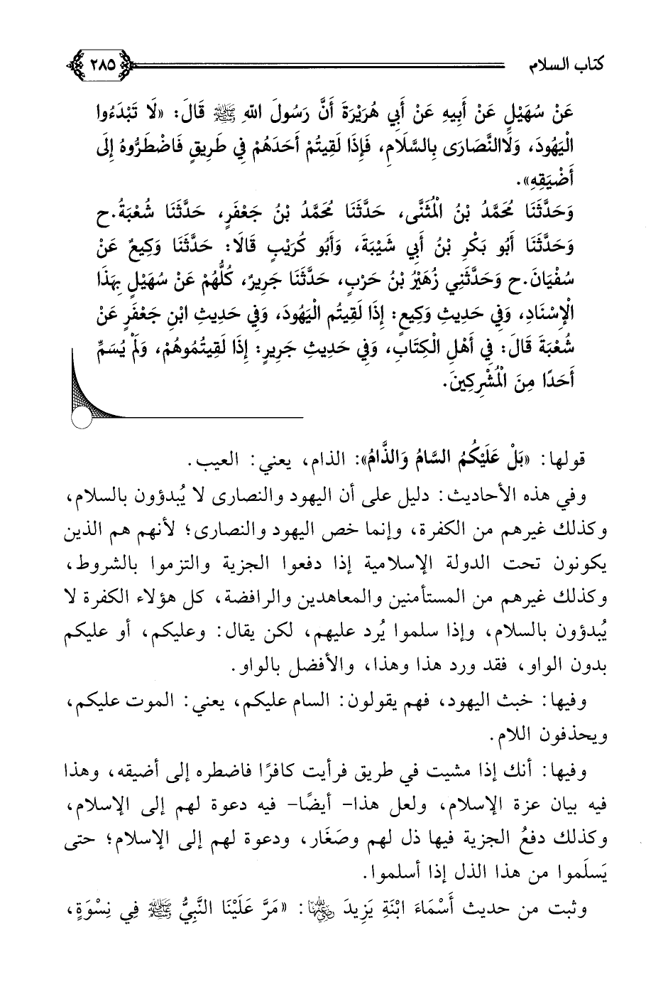 عَنْ سُهَيْلٍ عَنْ أَبِيهِ عَنْ أَبِي هُرَيْرَةَ أَنَّ رَسُولَ اللهِ صلى الله عليه وسلم قَالَ: ((لَا تَبْدَءُوا الْيَهُودَ، وَلَاالنَّصَارَى بِالسَّلَامِ، فَإِذَا لَقِيتُمْ أَحَدَهُمْ فِي طَرِيقٍ فَاضْطَرُّوهُ إِلَى أَضْيَقِهِ)).