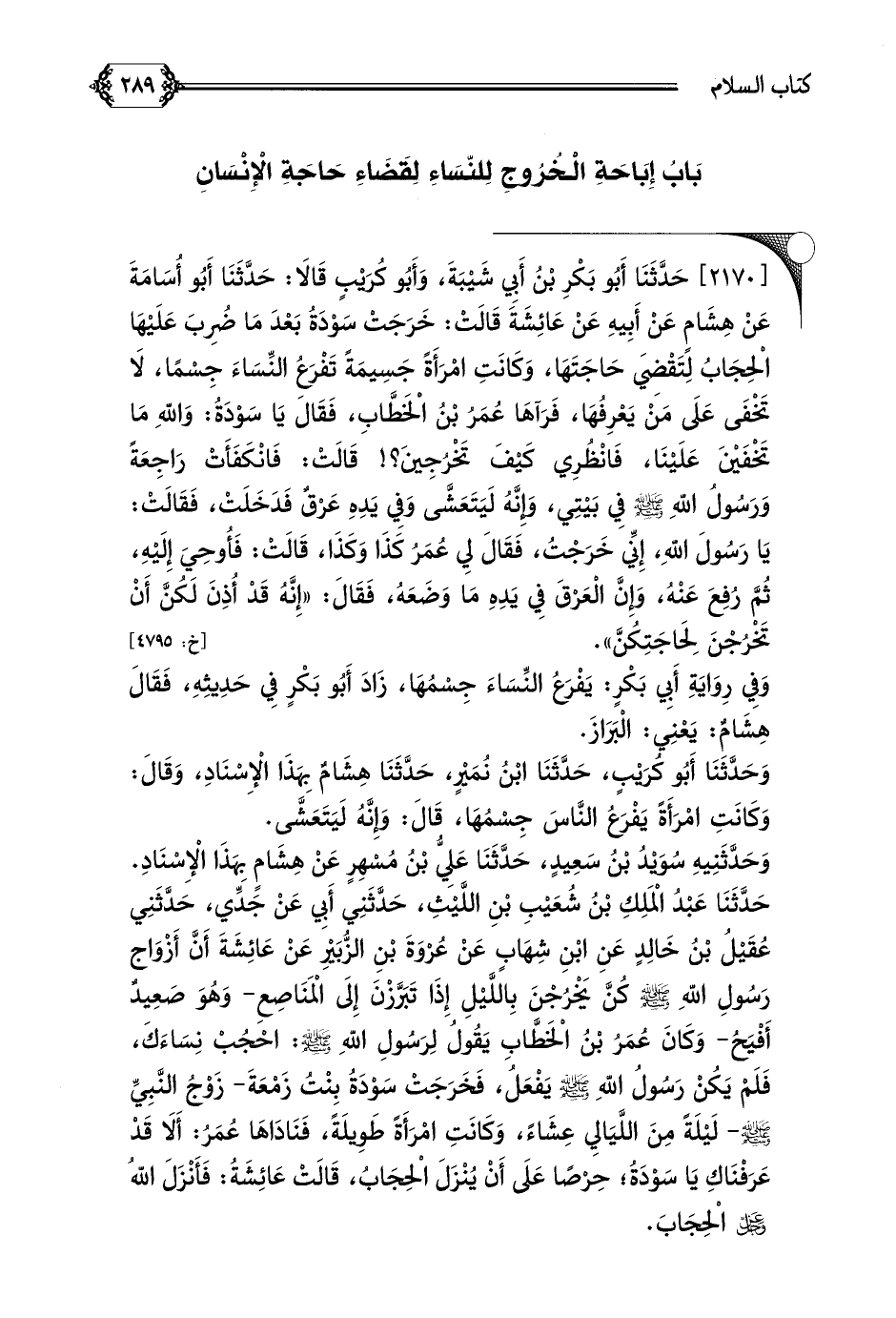 [٢١٧٠] حَدَّثَنَا أَبُو بَكْرِ بْنُ أَبِي شَيْبَةَ، وَأَبُو كُرَيْبٍ قَالَا: حَدَّثَنَا أَبُو أُسَامَةَ عَنْ هِشَامٍ عَنْ أَبِيهِ عَنْ عَائِشَةَ قَالَتْ: خَرَجَتْ سَوْدَةُ بَعْدَ مَا ضُرِبَ عَلَيْهَا الْحِجَابُ لِتَقْضِيَ حَاجَتَهَا، وَكَانَتِ امْرَأَةً جَسِيمَةً تَفْرَعُ النِّسَاءَ جِسْمًا، لَا تَخْفَى عَلَى مَنْ يَعْرِفُهَا، فَرَآهَا عُمَرُ بْنُ الْخَطَّابِ، فَقَالَ يَا سَوْدَةُ: وَاللهِ مَا تَخْفَيْنَ عَلَيْنَا، فَانْظُرِي كَيْفَ تَخْرُجِينَ؟ ! قَالَتْ: فَانْكَفَأَتْ رَاجِعَةً وَرَسُولُ اللهِ صلى الله عليه وسلم فِي بَيْتِي، وَإِنَّهُ لَيَتَعَشَّى وَفِي يَدِهِ عَرْقٌ فَدَخَلَتْ، فَقَالَتْ: يَا رَسُولَ اللهِ، إِنِّي خَرَجْتُ، فَقَالَ لِي عُمَرُ كَذَا وَكَذَا، قَالَتْ: فَأُوحِيَ إِلَيْهِ، ثُمَّ رُفِعَ عَنْهُ، وَإِنَّ الْعَرْقَ فِي يَدِهِ مَا وَضَعَهُ، فَقَالَ: ((إِنَّهُ قَدْ أُذِنَ لَكُنَّ أَنْ تَخْرُجْنَ لِحَاجَتِكُنَّ)).