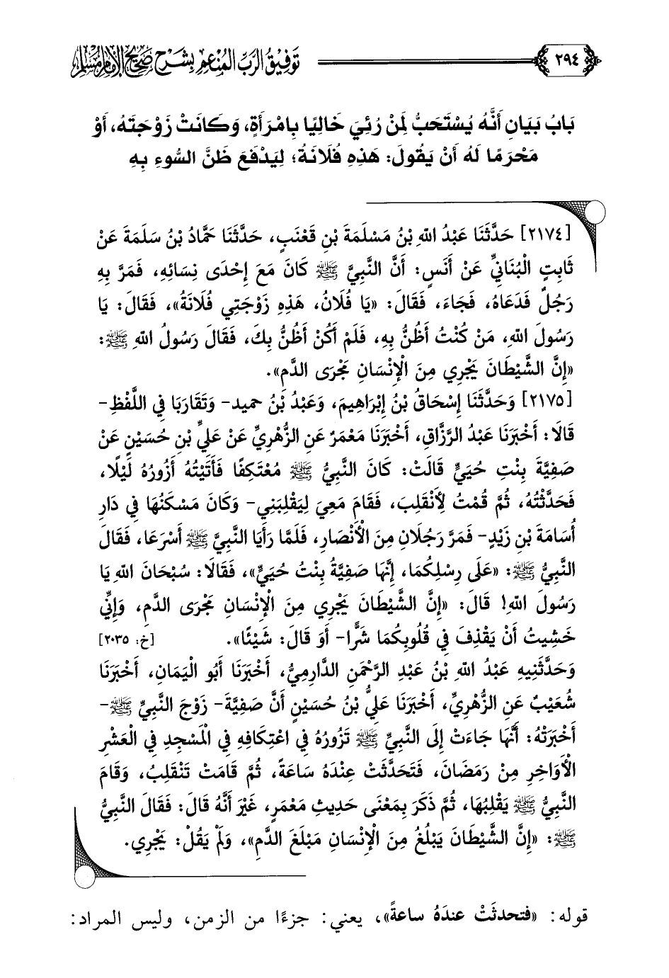 [٢١٧٤] حَدَّثَنَا عَبْدُ اللهِ بْنُ مَسْلَمَةَ بْنِ قَعْنَبٍ، حَدَّثَنَا حَمَّادُ بْنُ سَلَمَةَ عَنْ ثَابِتٍ الْبُنَانِيِّ عَنْ أَنَسٍ: أَنَّ النَّبِيَّ صلى الله عليه وسلم كَانَ مَعَ إِحْدَى نِسَائِهِ، فَمَرَّ بِهِ رَجُلٌ فَدَعَاهُ، فَجَاءَ، فَقَالَ: ((يَا فُلَانُ، هَذِهِ زَوْجَتِي فُلَانَةُ))، فَقَالَ: يَا رَسُولَ اللهِ، مَنْ كُنْتُ أَظُنُّ بِهِ، فَلَمْ أَكُنْ أَظُنُّ بِكَ، فَقَالَ رَسُولُ اللهِ صلى الله عليه وسلم: ((إِنَّ الشَّيْطَانَ يَجْرِي مِنَ الْإِنْسَانِ مَجْرَى الدَّمِ)).