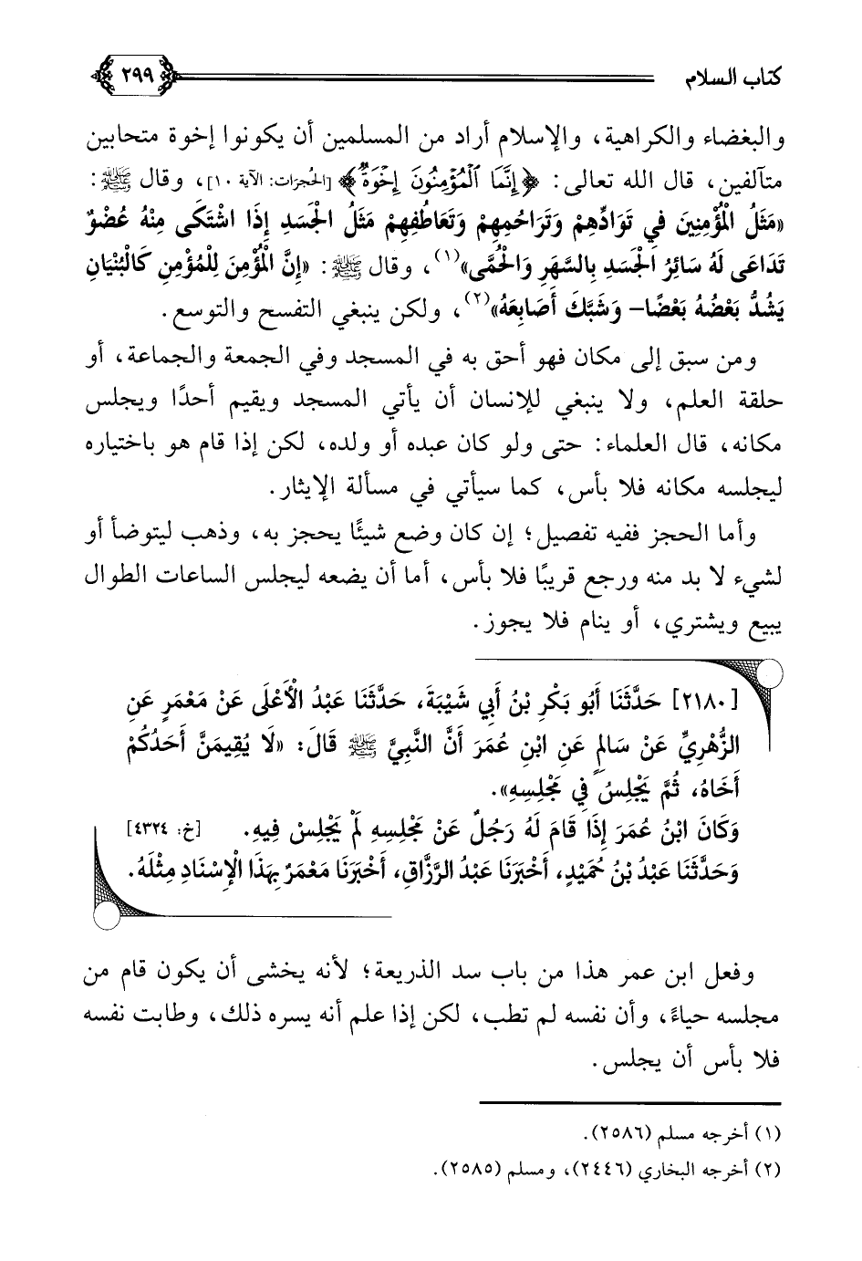 والبغضاء والكراهية، والإسلام أراد من المسلمين أن يكونوا إخوة متحابين متآلفين، قال الله تعالى: {إنما المؤمنون إخوة}، وقال عليه الصلاة والسلام: ((مَثَلُ الْمُؤْمِنِينَ فِي تَوَادِّهِمْ وَتَرَاحُمِهِمْ وَتَعَاطُفِهِمْ، مَثَلُ الْجَسَدِ إِذَا اشْتَكَى مِنْهُ عُضْوٌ تَدَاعَى لَهُ سَائِرُ الْجَسَدِ بِالسَّهَرِ وَالْحُمَّى)) (¬١)، وقال عليه الصلاة والسلام: ((إِنَّ الْمُؤْمِنَ لِلْمُؤْمِنِ كَالْبُنْيَانِ يَشُدُّ بَعْضُهُ بَعْضًا- وَشَبَّكَ أَصَابِعَهُ)) (¬٢)، ولكن ينبغي التفسح والتوسع.