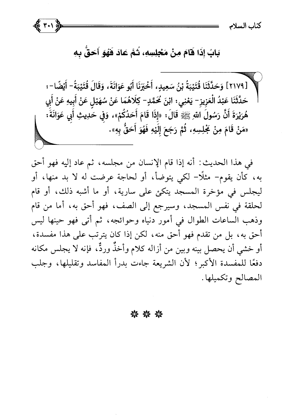 [٢١٧٩] وَحَدَّثَنَا قُتَيْبَةُ بْنُ سَعِيدٍ، أَخْبَرَنَا أَبُو عَوَانَةَ، وَقَالَ قُتَيْبَةُ- أَيْضًا-: حَدَّثَنَا عَبْدُ الْعَزِيزِ- يَعْنِي: ابْنَ مُحَمَّدٍ- كِلَاهُمَا عَنْ سُهَيْلٍ عَنْ أَبِيهِ عَنْ أَبِي هُرَيْرَةَ أَنَّ رَسُولَ اللهِ صلى الله عليه وسلم قَالَ: ((إِذَا قَامَ أَحَدُكُمْ))، وَفِي حَدِيثِ أَبِي عَوَانَةَ: ((مَنْ قَامَ مِنْ مَجْلِسِهِ، ثُمَّ رَجَعَ إِلَيْهِ فَهُوَ أَحَقُّ بِهِ)).