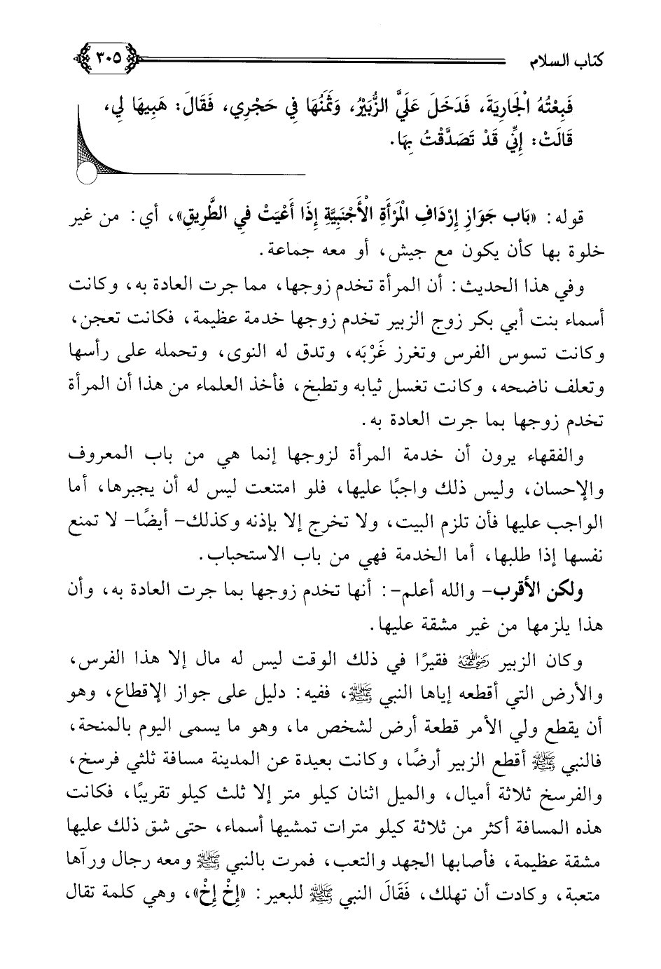 وكان الزبير رضي الله عنه فقيرًا في ذلك الوقت ليس له مال إلا هذا الفرس، والأرض التي أقطعه إياها النبي صلى الله عليه وسلم، ففيه: دليل على جواز الإقطاع، وهو أن يقطع ولي الأمر قطعة أرض لشخص ما، وهو ما يسمى اليوم بالمنحة، فالنبي صلى الله عليه وسلم أقطع الزبير أرضًا، وكانت بعيدة عن المدينة مسافة ثلثي فرسخ، والفرسخ ثلاثة أميال، والميل اثنان كيلو متر إلا ثلث كيلو تقريبًا، فكانت هذه المسافة أكثر من ثلاثة كيلو مترات تمشيها أسماء، حتى شق ذلك عليها مشقة عظيمة، فأصابها الجهد والتعب، فمرت بالنبي صلى الله عليه وسلم ومعه رجال ورآها متعبة، وكادت أن تهلك، فَقَالَ النبي صلى الله عليه وسلم للبعير: ((إِخْ إِخْ))، وهي كلمة تقال