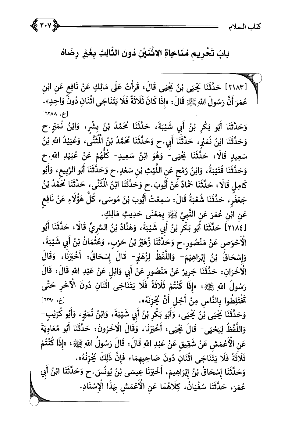 [٢١٨٣] حَدَّثَنَا يَحْيَى بْنُ يَحْيَى قَالَ: قَرَأْتُ عَلَى مَالِكٍ عَنْ نَافِعٍ عَنِ ابْنِ عُمَرَ أَنَّ رَسُولَ اللهِ صلى الله عليه وسلم قَالَ: ((إِذَا كَانَ ثَلَاثَةٌ فَلَا يَتَنَاجَى اثْنَانِ دُونَ وَاحِدٍ)).