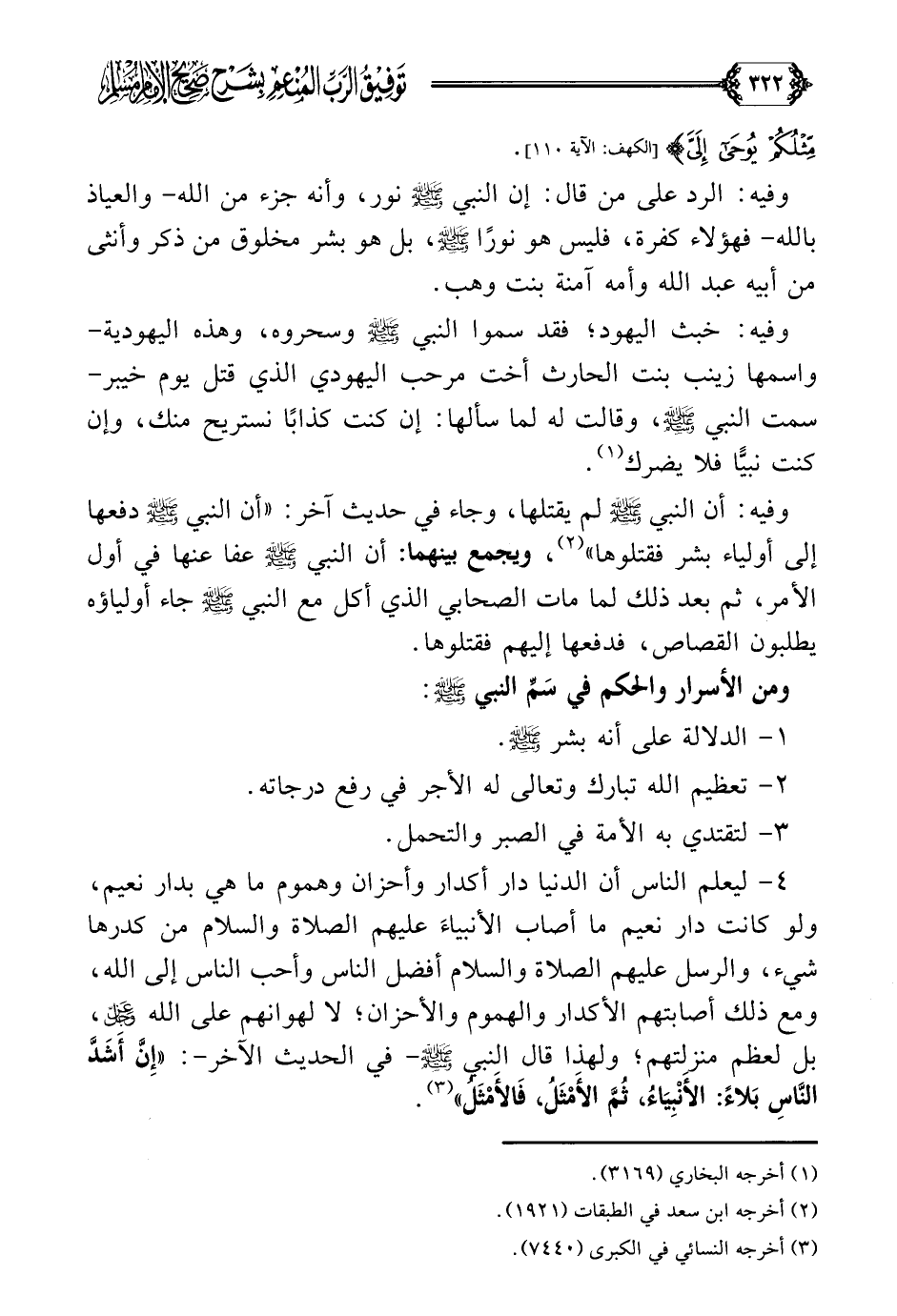 وفيه: الرد على من قال: إن النبي صلى الله عليه وسلم نور، وأنه جزء من الله- والعياذ بالله- فهؤلاء كفرة، ليس هو نورًا صلى الله عليه وسلم، بل هو بشر مخلوق من ذكر وأنثى من أبيه عبد الله وأمه آمنة بنت وهب.