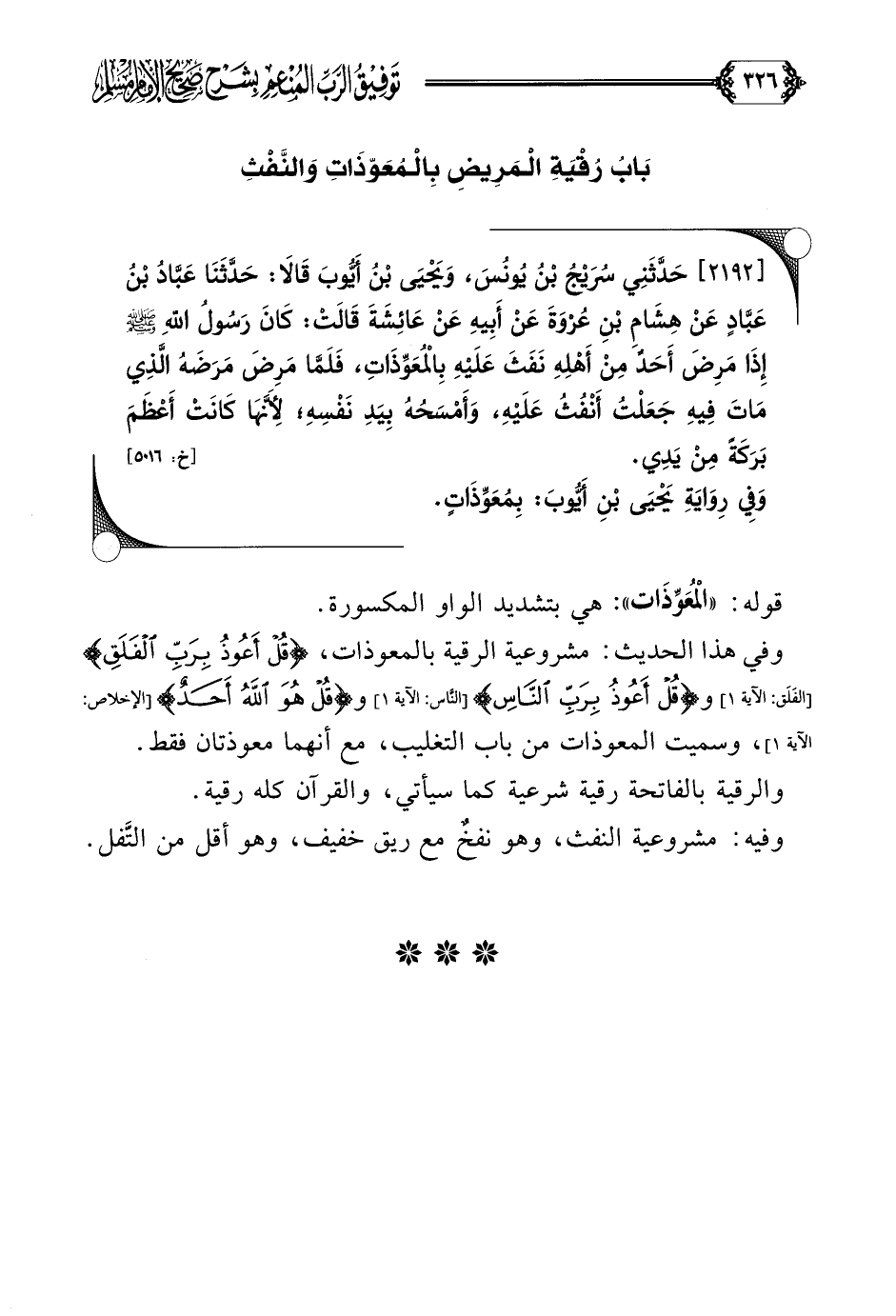 [٢١٩٢] حَدَّثَنِي سُرَيْجُ بْنُ يُونُسَ، وَيَحْيَى بْنُ أَيُّوبَ قَالَا: حَدَّثَنَا عَبَّادُ بْنُ عَبَّادٍ عَنْ هِشَامِ بْنِ عُرْوَةَ عَنْ أَبِيهِ عَنْ عَائِشَةَ قَالَتْ: كَانَ رَسُولُ اللهِ صلى الله عليه وسلم إِذَا مَرِضَ أَحَدٌ مِنْ أَهْلِهِ نَفَثَ عَلَيْهِ بِالْمُعَوِّذَاتِ، فَلَمَّا مَرِضَ مَرَضَهُ الَّذِي مَاتَ فِيهِ جَعَلْتُ أَنْفُثُ عَلَيْهِ، وَأَمْسَحُهُ بِيَدِ نَفْسِهِ؛ لِأَنَّهَا كَانَتْ أَعْظَمَ بَرَكَةً مِنْ يَدِي.