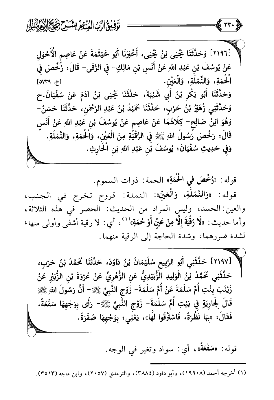 [٢١٩٦] وَحَدَّثَنَا يَحْيَى بْنُ يَحْيَى، أَخْبَرَنَا أَبُو خَيْثَمَةَ عَنْ عَاصِمٍ الْأَحْوَلِ عَنْ يُوسُفَ بْنِ عَبْدِ اللهِ عَنْ أَنَسِ بْنِ مَالِكٍ- فِي الرُّقَى- قَالَ: رُخِّصَ فِي الْحُمَةِ، وَالنَّمْلَةِ، وَالْعَيْنِ.