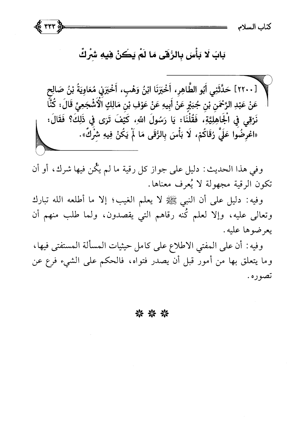 [٢٢٠٠] حَدَّثَنِي أَبُو الطَّاهِرِ، أَخْبَرَنَا ابْنُ وَهْبٍ، أَخْبَرَنِي مُعَاوِيَةُ بْنُ صَالِحٍ عَنْ عَبْدِ الرَّحْمَنِ بْنِ جُبَيْرٍ عَنْ أَبِيهِ عَنْ عَوْفِ بْنِ مَالِكٍ الْأَشْجَعِيِّ قَالَ: كُنَّا نَرْقِي فِي الْجَاهِلِيَّةِ، فَقُلْنَا: يَا رَسُولَ اللهِ، كَيْفَ تَرَى فِي ذَلِكَ؟ فَقَالَ: ((اعْرِضُوا عَلَيَّ رُقَاكُمْ، لَا بَأْسَ بِالرُّقَى مَا لَمْ يَكُنْ فِيهِ شِرْكٌ)).