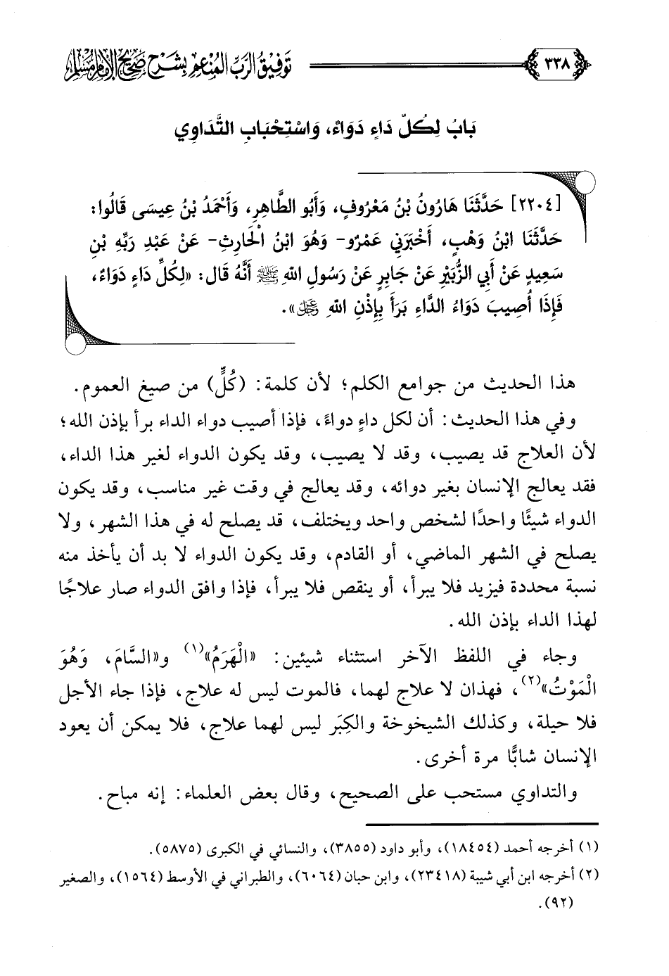 [٢٢٠٤] حَدَّثَنَا هَارُونُ بْنُ مَعْرُوفٍ، وَأَبُو الطَّاهِرِ، وَأَحْمَدُ بْنُ عِيسَى قَالُوا: حَدَّثَنَا ابْنُ وَهْبٍ، أَخْبَرَنِي عَمْرٌو- وَهُوَ ابْنُ الْحَارِثِ- عَنْ عَبْدِ رَبِّهِ بْنِ سَعِيدٍ عَنْ أَبِي الزُّبَيْرِ عَنْ جَابِرٍ عَنْ رَسُولِ اللهِ صلى الله عليه وسلم أَنَّهُ قَال: ((لِكُلِّ دَاءٍ دَوَاءٌ، فَإِذَا أُصِيبَ دَوَاءُ الدَّاءِ بَرَأَ بِإِذْنِ اللهِ عز وجل)).