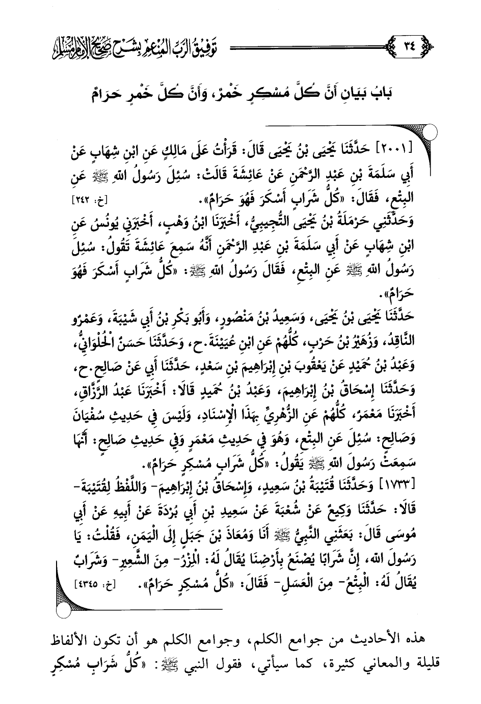 هذه الأحاديث من جوامع الكلم، وجوامع الكلم هو أن تكون الألفاظ قليلة والمعاني كثيرة، كما سيأتي، فقول النبي صلى الله عليه وسلم: ((كُلُّ شَرَابٍ مُسْكِرٍ