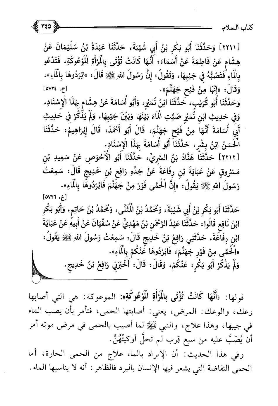 حَدَّثَنَا أَبُو بَكْرِ بْنُ أَبِي شَيْبَةَ، وَمُحَمَّدُ بْنُ الْمُثَنَّى، وَمُحَمَّدُ بْنُ حَاتِمٍ، وَأَبُو بَكْرِ بْنُ نَافِعٍ قَالُوا: حَدَّثَنَا عَبْدُ الرَّحْمَنِ بْنُ مَهْدِيٍّ عَنْ سُفْيَانَ عَنْ أَبِيهِ عَنْ عَبَايَةَ بْنِ رِفَاعَةَ، حَدَّثَنِي رَافِعُ بْنُ خَدِيجٍ قَالَ: سَمِعْتُ رَسُولَ اللهِ صلى الله عليه وسلم يَقُولُ: ((الْحُمَّى مِنْ فَوْرِ جَهَنَّمَ؛ فَابْرُدُوهَا عَنْكُمْ بِالْمَاءِ)).