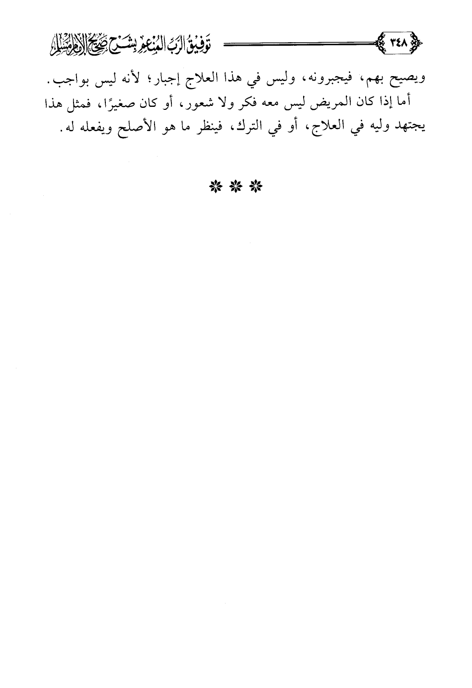 أما إذا كان المريض ليس معه فكر ولا شعور، أو كان صغيرًا، فمثل هذا يجتهد وليه في العلاج، أو في الترك، فينظر ما هو الأصلح ويفعله له.