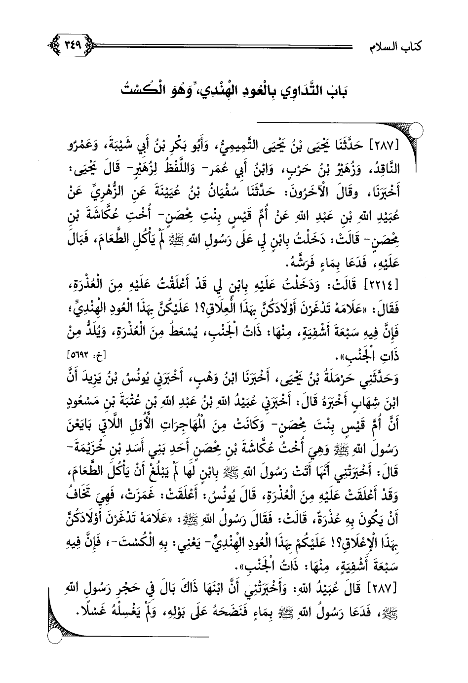 وَحَدَّثَنِي حَرْمَلَةُ بْنُ يَحْيَى، أَخْبَرَنَا ابْنُ وَهْبٍ، أَخْبَرَنِي يُونُسُ بْنُ يَزِيدَ أَنَّ ابْنَ شِهَابٍ أَخْبَرَهُ قَالَ: أَخْبَرَنِي عُبَيْدُ اللهِ بْنُ عَبْدِ اللهِ بْنِ عُتْبَةَ بْنِ مَسْعُودٍ أَنَّ أُمَّ قَيْسٍ بِنْتَ مِحْصَنٍ- وَكَانَتْ مِنَ الْمُهَاجِرَاتِ الْأُوَلِ اللَّاتِي بَايَعْنَ رَسُولَ اللهِ صلى الله عليه وسلم وَهِيَ أُخْتُ عُكَّاشَةَ بْنِ مِحْصَنٍ أَحَدِ بَنِي أَسَدِ بْنِ خُزَيْمَةَ- قَالَ: أَخْبَرَتْنِي أَنَّهَا أَتَتْ رَسُولَ اللهِ صلى الله عليه وسلم بِابْنٍ لَهَا لَمْ يَبْلُغْ أَنْ يَأْكُلَ الطَّعَامَ، وَقَدْ أَعْلَقَتْ عَلَيْهِ مِنَ الْعُذْرَةِ، قَالَ يُونُسُ: أَعْلَقَتْ: غَمَزَتْ، فَهِيَ تَخَافُ أَنْ يَكُونَ بِهِ عُذْرَةٌ، قَالَتْ: فَقَالَ رَسُولُ اللهِ صلى الله عليه وسلم: ((عَلَامَهْ تَدْغَرْنَ أَوْلَادَكُنَّ بِهَذَا الْإِعْلَاقِ؟ ! عَلَيْكُمْ بِهَذَا الْعُودِ الْهِنْدِيِّ- يَعْنِي: بِهِ الْكُسْتَ-؛ فَإِنَّ فِيهِ سَبْعَةَ أَشْفِيَةٍ، مِنْهَا: ذَاتُ الْجَنْبِ)).