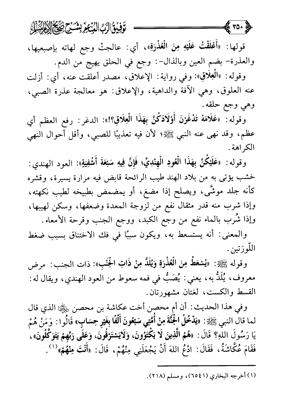 وقوله: ((عَلَيْكُنَّ بِهَذَا الْعُودِ الْهِنْدِيِّ؛ فَإِنَّ فِيهِ سَبْعَةَ أَشْفِيَةٍ)) العود الهندي: خشب يؤتى به من بلاد الهند طيب الرائحة قابض فيه مرارة يسيرة، وقشره كأنه جلد موشَّى، ويصلح إذا مضغ، أو يمضمض بطبيخه لطيب نكهته، وإذا شرب منه قدر مثقال نفع من لزوجة المعدة وضعفها، وسكن لهيبها، وإذا شُرب بالماء نفع من وجع الكبد، ووجع الجنب وقرحة الأمعاء.