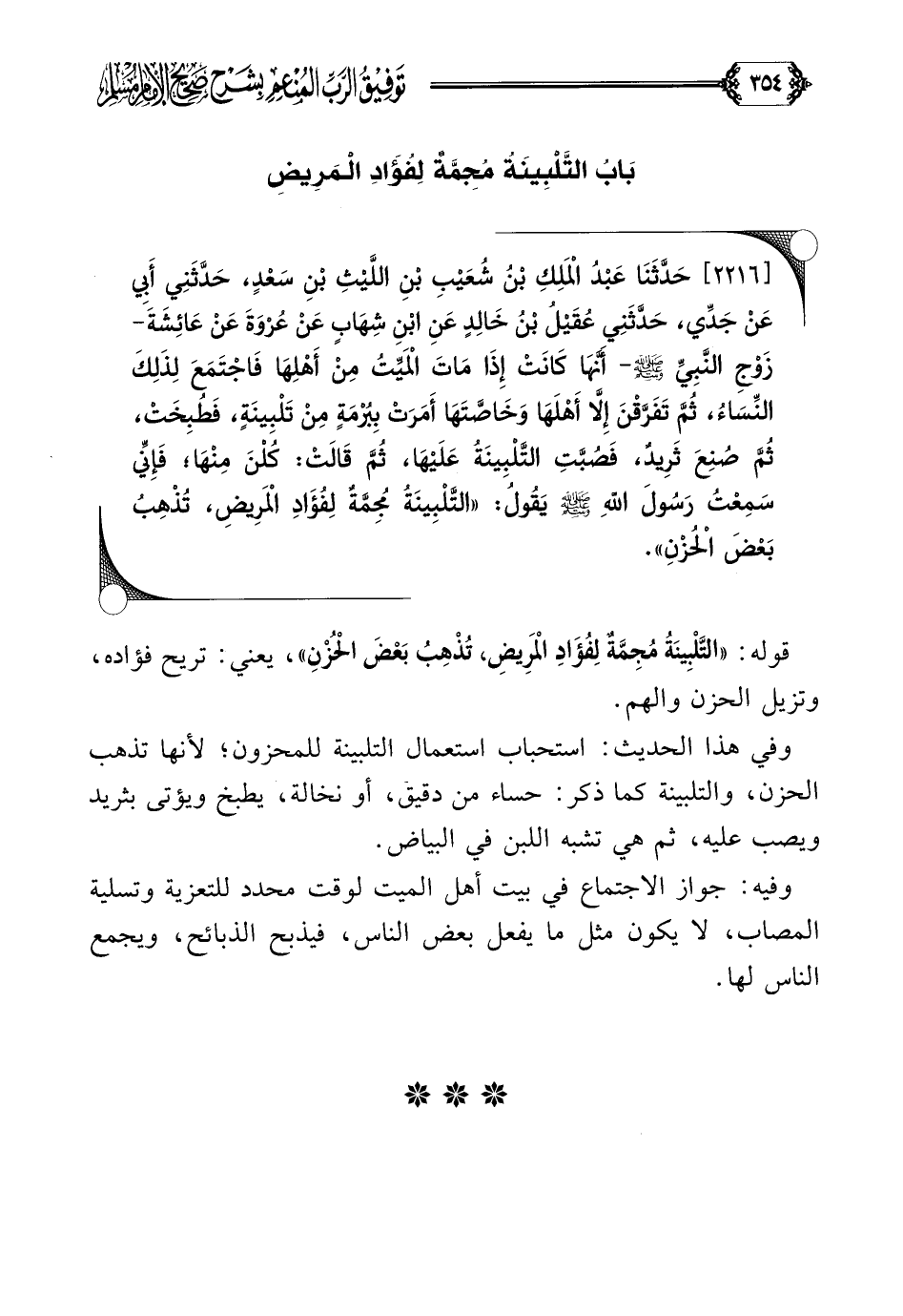 [٢٢١٦] حَدَّثَنَا عَبْدُ الْمَلِكِ بْنُ شُعَيْبِ بْنِ اللَّيْثِ بْنِ سَعْدٍ، حَدَّثَنِي أَبِي عَنْ جَدِّي، حَدَّثَنِي عُقَيْلُ بْنُ خَالِدٍ عَنِ ابْنِ شِهَابٍ عَنْ عُرْوَةَ عَنْ عَائِشَةَ- زَوْجِ النَّبِيِّ صلى الله عليه وسلم- أَنَّهَا كَانَتْ إِذَا مَاتَ الْمَيِّتُ مِنْ أَهْلِهَا فَاجْتَمَعَ لِذَلِكَ النِّسَاءُ، ثُمَّ تَفَرَّقْنَ إِلَّا أَهْلَهَا وَخَاصَّتَهَا أَمَرَتْ بِبُرْمَةٍ مِنْ تَلْبِينَةٍ، فَطُبِخَتْ، ثُمَّ صُنِعَ ثَرِيدٌ، فَصُبَّتِ التَّلْبِينَةُ عَلَيْهَا، ثُمَّ قَالَتْ: كُلْنَ مِنْهَا؛ فَإِنِّي سَمِعْتُ رَسُولَ اللهِ صلى الله عليه وسلم يَقُولُ: ((التَّلْبِينَةُ مُجِمَّةٌ لِفُؤَادِ الْمَرِيضِ، تُذْهِبُ بَعْضَ الْحُزْنِ)).