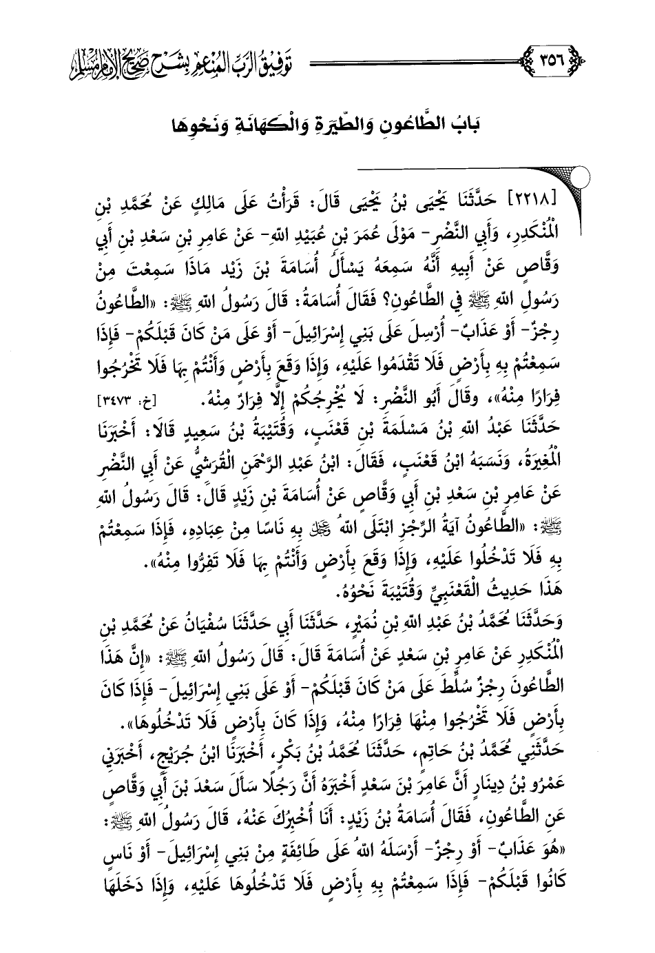 حَدَّثَنَا عَبْدُ اللهِ بْنُ مَسْلَمَةَ بْنِ قَعْنَبٍ، وَقُتَيْبَةُ بْنُ سَعِيدٍ قَالَا: أَخْبَرَنَا الْمُغِيرَةُ، وَنَسَبَهُ ابْنُ قَعْنَبٍ، فَقَالَ: ابْنُ عَبْدِ الرَّحْمَنِ الْقُرَشِيُّ عَنْ أَبِي النَّضْرِ عَنْ عَامِرِ بْنِ سَعْدِ بْنِ أَبِي وَقَّاصٍ عَنْ أُسَامَةَ بْنِ زَيْدٍ قَالَ: قَالَ رَسُولُ اللهِ صلى الله عليه وسلم: ((الطَّاعُونُ آيَةُ الرِّجْزِ ابْتَلَى اللهُ عز وجل بِهِ نَاسًا مِنْ عِبَادِهِ، فَإِذَا سَمِعْتُمْ بِهِ فَلَا تَدْخُلُوا عَلَيْهِ، وَإِذَا وَقَعَ بِأَرْضٍ وَأَنْتُمْ بِهَا فَلَا تَفِرُّوا مِنْهُ)).