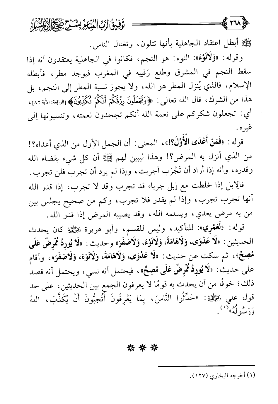 وقوله: ((وَلَانَوْءَ)): النوء: هو النجم، فكانوا في الجاهلية يعتقدون أنه إذا سقط النجم في المشرق وطلع رَقيبه في المغرب فيوجد مطر، فأبطله الإسلام، فالذي يُنزل المطر هو الله، ولا يجوز نسبة المطر إلى النجم، بل هذا من الشرك، قال الله تعالى: {وَتَجْعَلُونَ رِزْقَكُمْ أَنَّكُمْ تُكَذِّبُونَ}، أي: تجعلون شكركم على نعمة الله أنكم تجحدون نعمته، وتنسبونها إلى غيره.