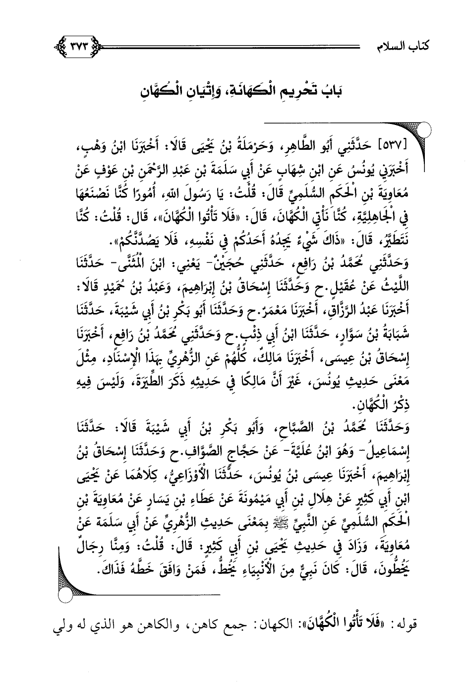 [٥٣٧] حَدَّثَنِي أَبُو الطَّاهِرِ، وَحَرْمَلَةُ بْنُ يَحْيَى قَالَا: أَخْبَرَنَا ابْنُ وَهْبٍ، أَخْبَرَنِي يُونُسُ عَنِ ابْنِ شِهَابٍ عَنْ أَبِي سَلَمَةَ بْنِ عَبْدِ الرَّحْمَنِ بْنِ عَوْفٍ عَنْ مُعَاوِيَةَ بْنِ الْحَكَمِ السُّلَمِيِّ قَالَ: قُلْتُ: يَا رَسُولَ اللهِ، أُمُورًا كُنَّا نَصْنَعُهَا فِي الْجَاهِلِيَّةِ، كُنَّا نَأْتِي الْكُهَّانَ، قَالَ: ((فَلَا تَأْتُوا الْكُهَّانَ))، قَال: قُلْتُ: كُنَّا نَتَطَيَّرُ، قَالَ: ((ذَاكَ شَيْءٌ يَجِدُهُ أَحَدُكُمْ فِي نَفْسِهِ، فَلَا يَصُدَّنَّكُمْ)).