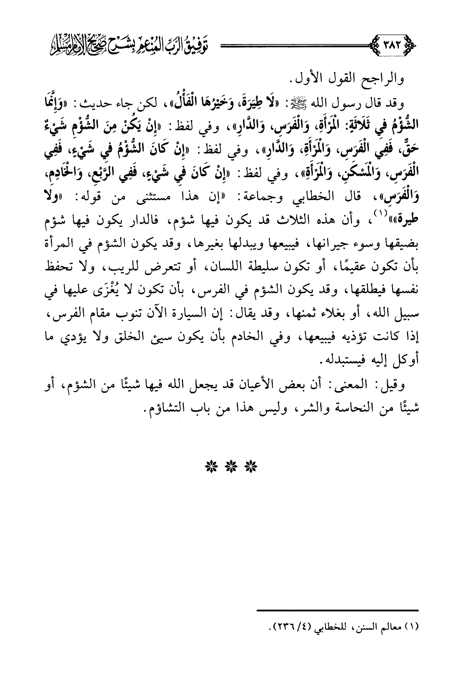وقد قال رسول الله صلى الله عليه وسلم: ((لَا طِيَرَةَ، وَخَيْرُهَا الْفَأْلُ))، لكن جاء حديث: ((وَإِنَّمَا الشُّؤْمُ فِي ثَلَاثَةٍ: الْمَرْأَةِ، وَالْفَرَسِ، وَالدَّارِ))، وفي لفظ: ((إِنْ يَكُنْ مِنَ الشُّؤْمِ شَيْءٌ حَقٌّ، فَفِي الْفَرَسِ، وَالْمَرْأَةِ، وَالدَّارِ))، وفي لفظ: ((إِنْ كَانَ الشُّؤْمُ فِي شَيْءٍ، فَفِي الْفَرَسِ، وَالْمَسْكَنِ، وَالْمَرْأَةِ))، وفي لفظ: ((إِنْ كَانَ فِي شَيْءٍ، فَفِي الرَّبْعِ، وَالْخَادِمِ، وَالْفَرَسِ))، قال الخطابي وجماعة: ((إن هذا مستثنى من قوله: ((ولا طيرة)))) (¬١)، وأن هذه الثلاث قد يكون فيها شؤم، فالدار يكون فيها شؤم بضيقها وسوء جيرانها، فيبيعها ويبدلها بغيرها، وقد يكون الشؤم في المرأة بأن تكون عقيمًا، أو تكون سليطة اللسان، أو تتعرض للريب، ولا تحفظ نفسها فيطلقها، وقد يكون الشؤم في الفرس، بأن تكون لا يُغْزَى عليها في سبيل الله، أو بغلاء ثمنها، وقد يقال: إن السيارة الآن تنوب مقام الفرس، إذا كانت تؤذيه فيبيعها، وفي الخادم بأن يكون سيئ الخلق ولا يؤدي ما أوكل إليه فيستبدله.