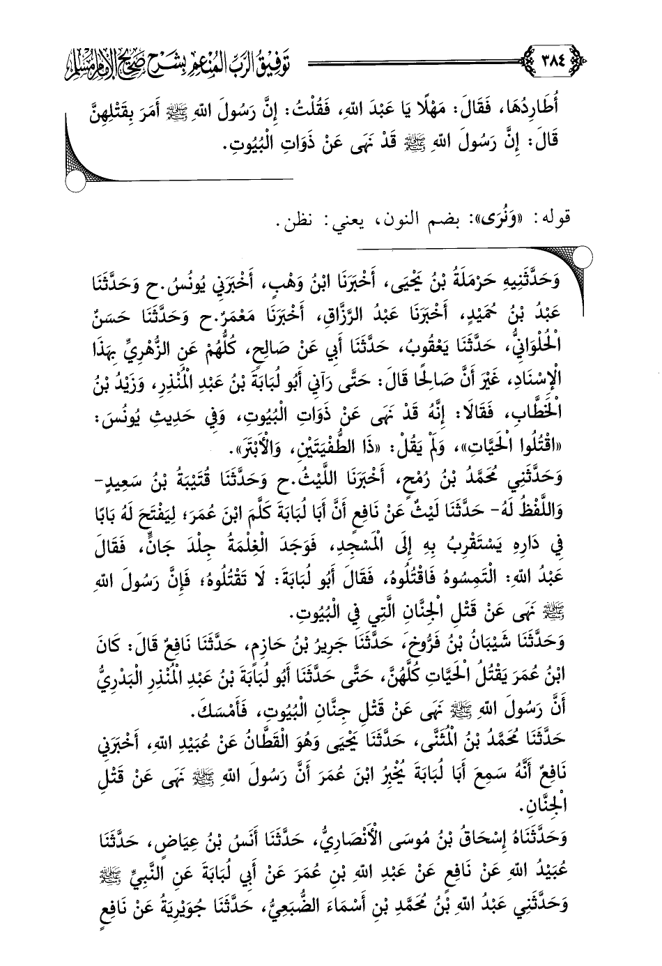 وَحَدَّثَنَا شَيْبَانُ بْنُ فَرُّوخَ، حَدَّثَنَا جَرِيرُ بْنُ حَازِمٍ، حَدَّثَنَا نَافِعٌ قَالَ: كَانَ ابْنُ عُمَرَ يَقْتُلُ الْحَيَّاتِ كُلَّهُنَّ، حَتَّى حَدَّثَنَا أَبُو لُبَابَةَ بْنُ عَبْدِ الْمُنْذِرِ الْبَدْرِيُّ أَنَّ رَسُولَ اللهِ صلى الله عليه وسلم نَهَى عَنْ قَتْلِ جِنَّانِ الْبُيُوتِ، فَأَمْسَكَ.