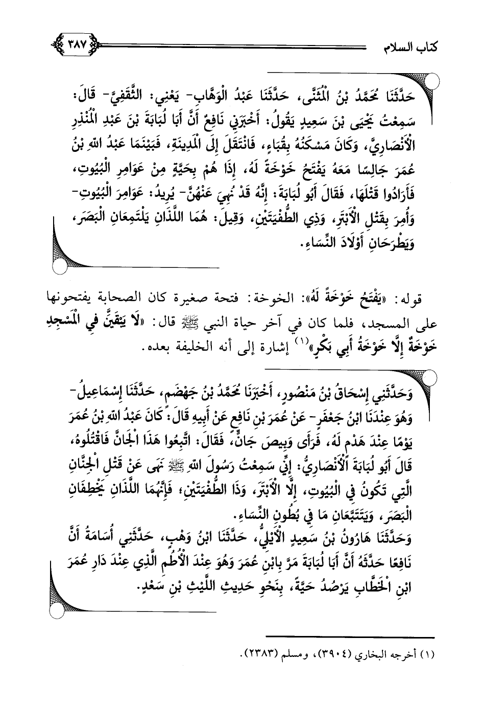 حَدَّثَنَا مُحَمَّدُ بْنُ الْمُثَنَّى، حَدَّثَنَا عَبْدُ الْوَهَّابِ- يَعْنِي: الثَّقَفِيَّ- قَالَ: سَمِعْتُ يَحْيَى بْنَ سَعِيدٍ يَقُولُ: أَخْبَرَنِي نَافِعٌ أَنَّ أَبَا لُبَابَةَ بْنَ عَبْدِ الْمُنْذِرِ الْأَنْصَارِيَّ، وَكَانَ مَسْكَنُهُ بِقُبَاءٍ، فَانْتَقَلَ إِلَى الْمَدِينَةِ، فَبَيْنَمَا عَبْدُ اللهِ بْنُ عُمَرَ جَالِسًا مَعَهُ يَفْتَحُ خَوْخَةً لَهُ، إِذَا هُمْ بِحَيَّةٍ مِنْ عَوَامِرِ الْبُيُوتِ، فَأَرَادُوا قَتْلَهَا، فَقَالَ أَبُو لُبَابَةَ: إِنَّهُ قَدْ نُهِيَ عَنْهُنَّ- يُرِيدُ: عَوَامِرَ الْبُيُوتِ- وَأُمِرَ بِقَتْلِ الْأَبْتَرِ، وَذِي الطُّفْيَتَيْنِ، وَقِيلَ: هُمَا اللَّذَانِ يَلْتَمِعَانِ الْبَصَرَ، وَيَطْرَحَانِ أَوْلَادَ النِّسَاءِ.