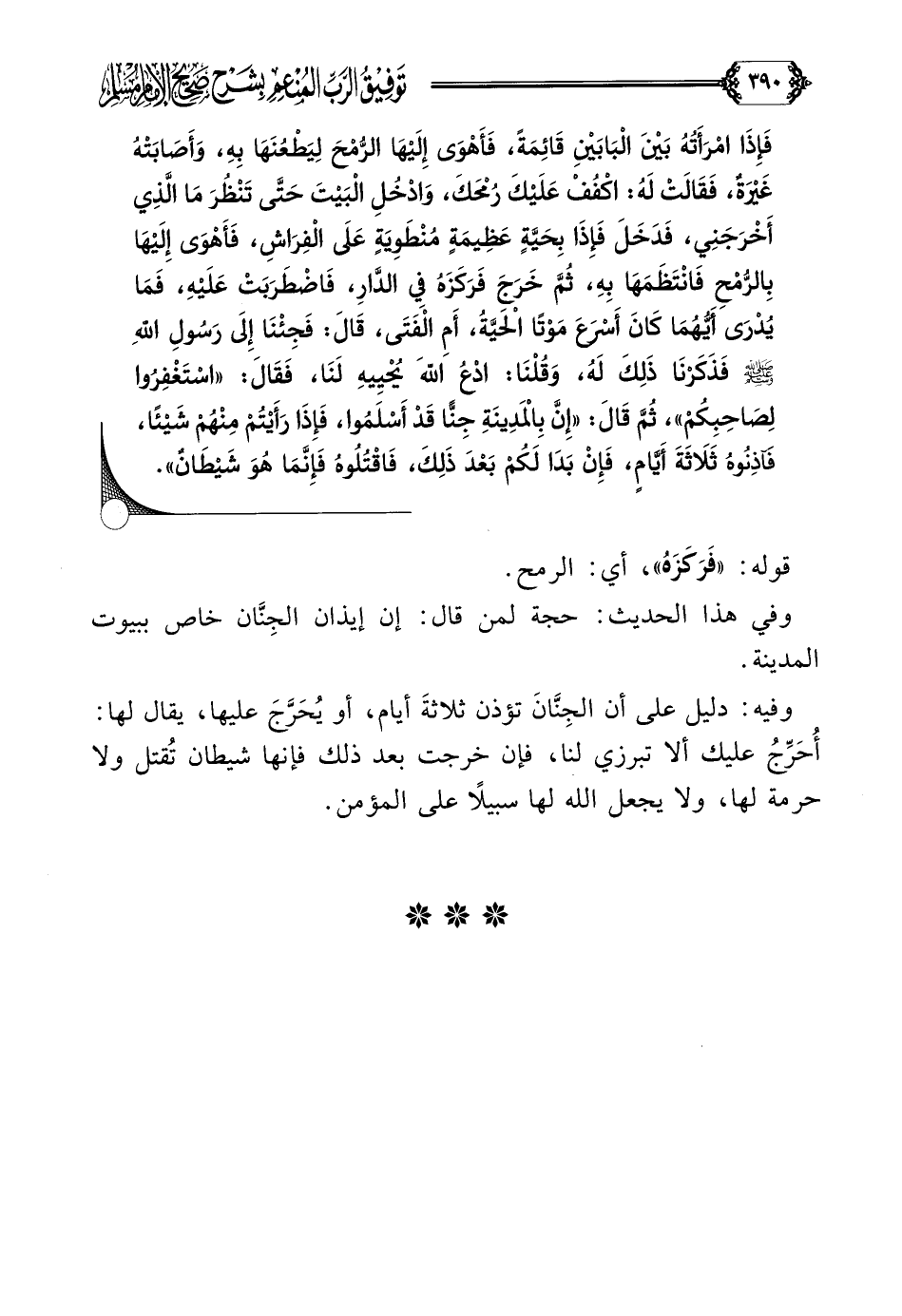 وفيه: دليل على أن الجِنَّانَ تؤذن ثلاثةَ أيام، أو يُحَرَّجَ عليها، يقال لها: أُحَرِّجُ عليك ألا تبرزي لنا، فإن خرجت بعد ذلك فإنها شيطان تُقتل ولا حرمة لها، ولا يجعل الله لها سبيلًا على المؤمن.