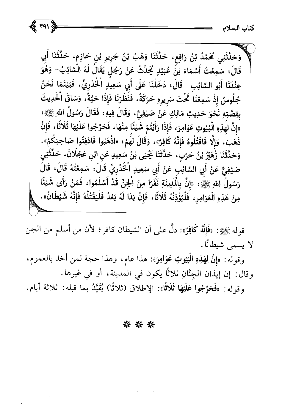 وَحَدَّثَنَا زُهَيْرُ بْنُ حَرْبٍ، حَدَّثَنَا يَحْيَى بْنُ سَعِيدٍ عَنِ ابْنِ عَجْلَانَ، حَدَّثَنِي صَيْفِيٌّ عَنْ أَبِي السَّائِبِ عَنْ أَبِي سَعِيدٍ الْخُدْرِيِّ قَالَ: سَمِعْتُهُ قَالَ: قَالَ رَسُولُ اللهِ صلى الله عليه وسلم: ((إِنَّ بِالْمَدِينَةِ نَفَرًا مِنَ الْجِنِّ قَدْ أَسْلَمُوا، فَمَنْ رَأَى شَيْئًا مِنْ هَذِهِ الْعَوَامِرِ، فَلْيُؤْذِنْهُ ثَلَاثًا، فَإِنْ بَدَا لَهُ بَعْدُ فَلْيَقْتُلْهُ فَإِنَّهُ شَيْطَانٌ)).