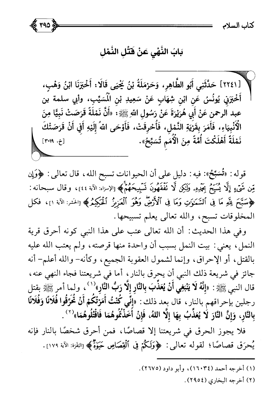 [٢٢٤١] حَدَّثَنِي أَبُو الطَّاهِرِ، وَحَرْمَلَةُ بْنُ يَحْيَى قَالَا: أَخْبَرَنَا ابْنُ وَهْبٍ، أَخْبَرَنِي يُونُسُ عَنِ ابْنِ شِهَابٍ عَنْ سَعِيدِ بْنِ الْمُسَيِّبِ، وأبي سلمة بن عبد الرحمن عَنْ أَبِي هُرَيْرَةَ عَنْ رَسُولِ اللهِ صلى الله عليه وسلم: ((أَنَّ نَمْلَةً قَرَصَتْ نَبِيًّا مِنَ الْأَنْبِيَاءِ، فَأَمَرَ بِقَرْيَةِ النَّمْلِ، فَأُحْرِقَتْ، فَأَوْحَى اللهُ إِلَيْهِ أَفِي أَنْ قَرَصَتْكَ نَمْلَةٌ أَهْلَكْتَ أُمَّةً مِنَ الْأُمَمِ تُسَبِّحُ)).
