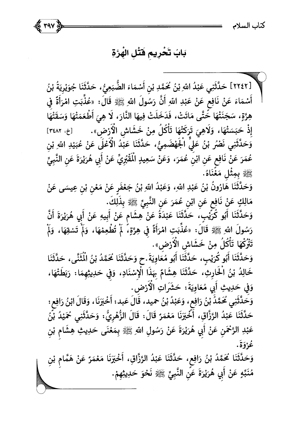 [٢٢٤٢] حَدَّثَنِي عَبْدُ اللهِ بْنُ مُحَمَّدِ بْنِ أَسْمَاءَ الضُّبَعِيُّ، حَدَّثَنَا جُوَيْرِيَةُ بْنُ أَسْمَاءَ عَنْ نَافِعٍ عَنْ عَبْدِ اللهِ أَنَّ رَسُولَ اللهِ صلى الله عليه وسلم قَالَ: ((عُذِّبَتِ امْرَأَةٌ فِي هِرَّةٍ، سَجَنَتْهَا حَتَّى مَاتَتْ، فَدَخَلَتْ فِيهَا النَّارَ، لَا هِيَ أَطْعَمَتْهَا وَسَقَتْهَا إِذْ حَبَسَتْهَا، وَلَاهِيَ تَرَكَتْهَا تَأْكُلُ مِنْ خَشَاشِ الْأَرْضِ)).