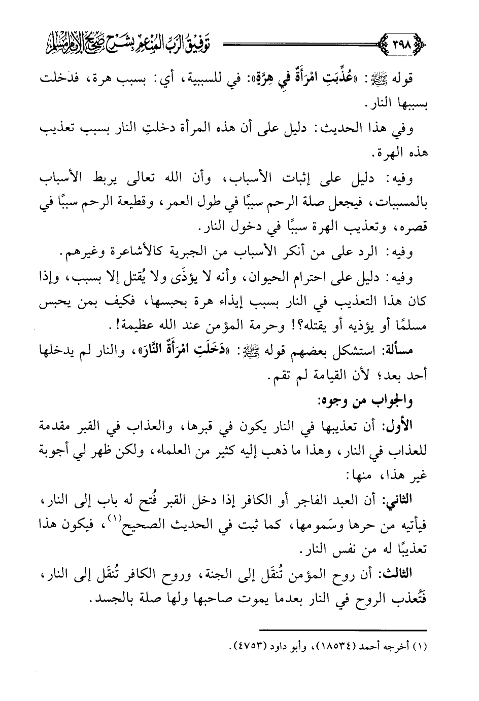 قوله صلى الله عليه وسلم: ((عُذِّبَتِ امْرَأَةٌ فِي هِرَّةٍ)) في للسببية، أي: بسبب هرة، فدخلت بسببها النار.