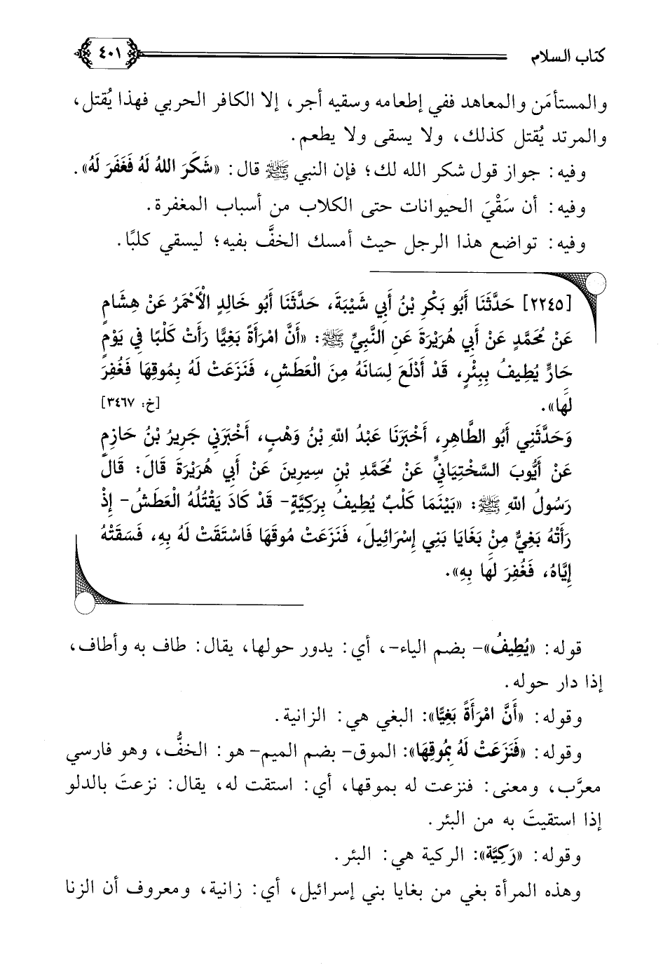 [٢٢٤٥] حَدَّثَنَا أَبُو بَكْرِ بْنُ أَبِي شَيْبَةَ، حَدَّثَنَا أَبُو خَالِدٍ الْأَحْمَرُ عَنْ هِشَامٍ عَنْ مُحَمَّدٍ عَنْ أَبِي هُرَيْرَةَ عَنِ النَّبِيِّ صلى الله عليه وسلم: ((أَنَّ امْرَأَةً بَغِيًّا رَأَتْ كَلْبًا فِي يَوْمٍ حَارٍّ يُطِيفُ بِبِئْرٍ، قَدْ أَدْلَعَ لِسَانَهُ مِنَ الْعَطَشِ، فَنَزَعَتْ لَهُ بِمُوقِهَا فَغُفِرَ لَهَا)).
