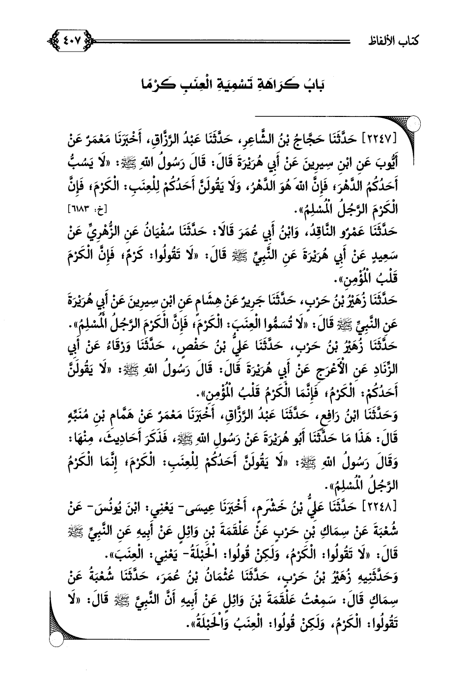 حَدَّثَنَا زُهَيْرُ بْنُ حَرْبٍ، حَدَّثَنَا جَرِيرٌ عَنْ هِشَامٍ عَنِ ابْنِ سِيرِينَ عَنْ أَبِي هُرَيْرَةَ عَنِ النَّبِيِّ صلى الله عليه وسلم قَالَ: ((لَا تُسَمُّوا الْعِنَبَ: الْكَرْمَ؛ فَإِنَّ الْكَرْمَ الرَّجُلُ الْمُسْلِمُ)).