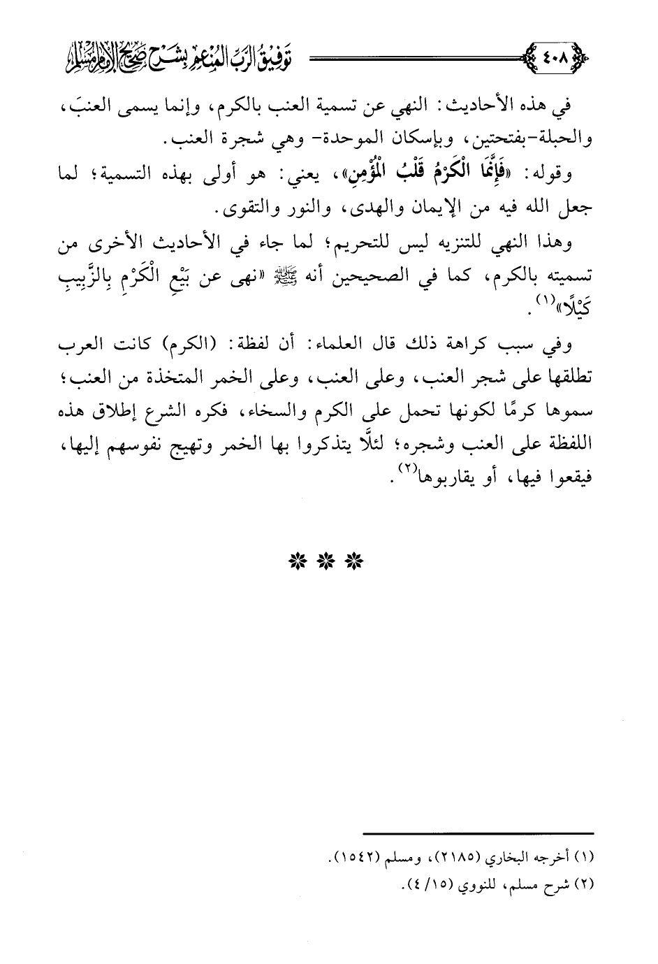 وفي سبب كراهة ذلك قال العلماء: أن لفظة: (الكرم) كانت العرب تطلقها على شجر العنب، وعلى العنب، وعلى الخمر المتخذة من العنب؛ سموها كرمًا لكونها تحمل على الكرم والسخاء، فكره الشرع إطلاق هذه اللفظة على العنب وشجره؛ لئلَّا يتذكروا بها الخمر وتهيج نفوسهم إليها، فيقعوا فيها، أو يقاربوها (¬٢).