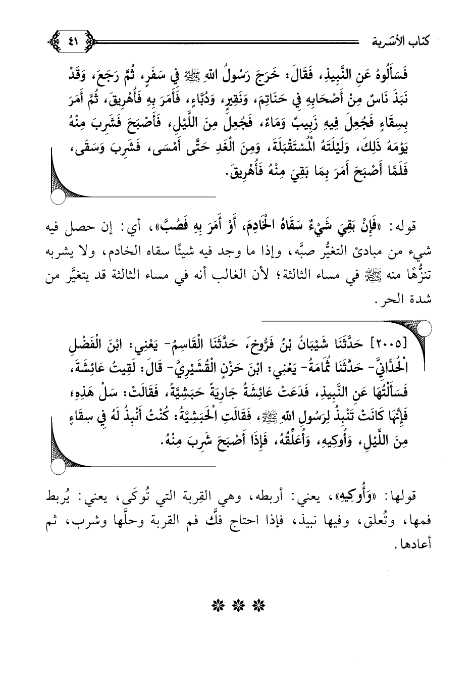 [٢٠٠٥] حَدَّثَنَا شَيْبَانُ بْنُ فَرُّوخَ، حَدَّثَنَا الْقَاسِمُ- يَعْنِي: ابْنَ الْفَضْلِ الْحُدَّانِيَّ- حَدَّثَنَا ثُمَامَةُ- يَعْنِي: ابْنَ حَزْنٍ الْقُشَيْرِيَّ- قَالَ: لَقِيتُ عَائِشَةَ، فَسَأَلْتُهَا عَنِ النَّبِيذِ، فَدَعَتْ عَائِشَةُ جَارِيَةً حَبَشِيَّةً، فَقَالَتْ: سَلْ هَذِهِ؛ فَإِنَّهَا كَانَتْ تَنْبِذُ لِرَسُولِ اللَّهِ صلى الله عليه وسلم، فَقَالَتْ الْحَبَشِيَّةُ: كُنْتُ أَنْبِذُ لَهُ فِي سِقَاءٍ مِنَ اللَّيْلِ، وَأُوكِيهِ، وَأُعَلِّقُهُ، فَإِذَا أَصْبَحَ شَرِبَ مِنْهُ.