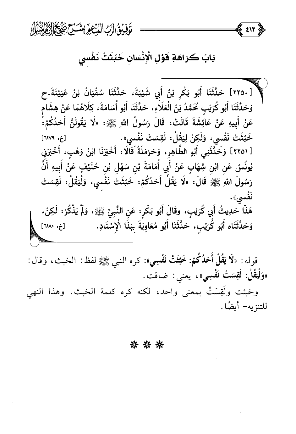 [٢٢٥٠] حَدَّثَنَا أَبُو بَكْرِ بْنُ أَبِي شَيْبَةَ، حَدَّثَنَا سُفْيَانُ بْنُ عُيَيْنَةَ. ح وَحَدَّثَنَا أَبُو كُرَيْبٍ مُحَمَّدُ بْنُ الْعَلَاءِ، حَدَّثَنَا أَبُو أُسَامَةَ، كِلَاهُمَا عَنْ هِشَامٍ عَنْ أَبِيهِ عَنْ عَائِشَةَ قَالَتْ: قَالَ رَسُولُ اللهِ صلى الله عليه وسلم: ((لَا يَقُولَنَّ أَحَدُكُمْ: خَبُثَتْ نَفْسِي، وَلَكِنْ لِيَقُلْ: لَقِسَتْ نَفْسِي)).