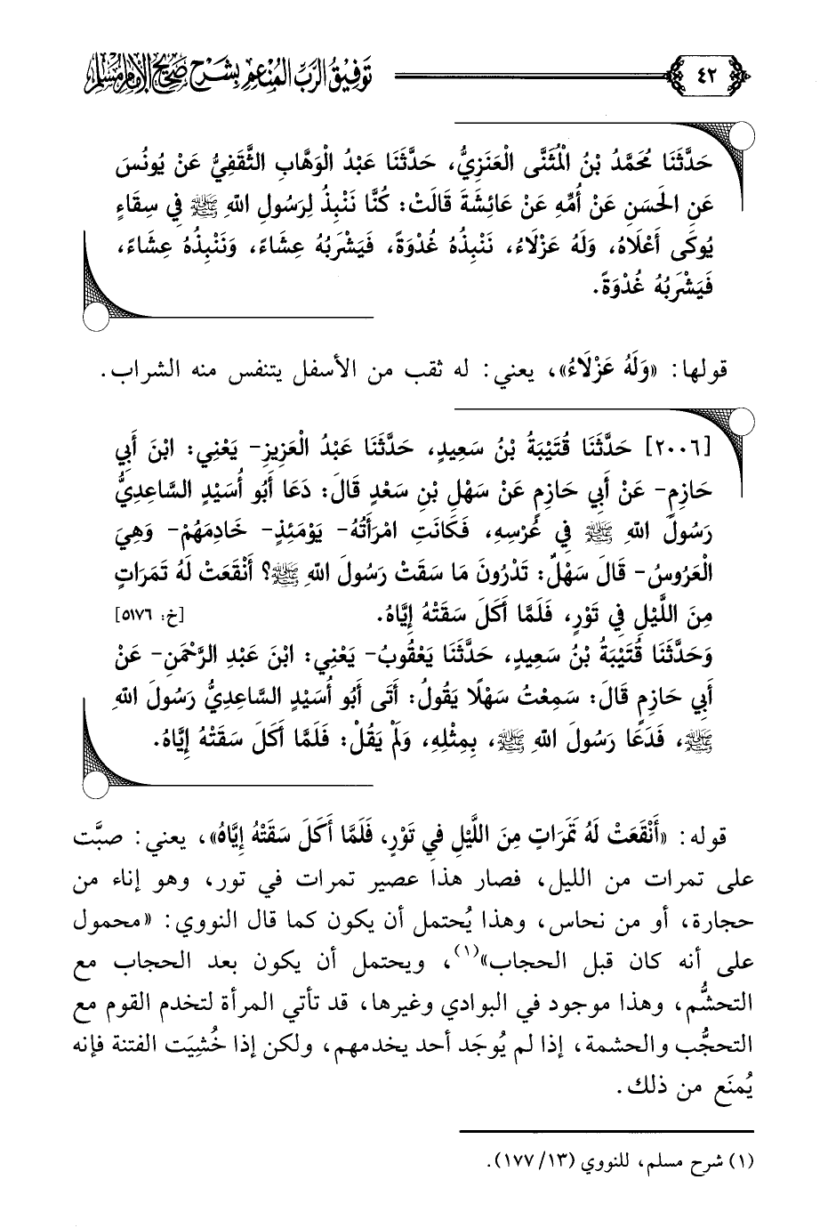 [٢٠٠٦] حَدَّثَنَا قُتَيْبَةُ بْنُ سَعِيدٍ، حَدَّثَنَا عَبْدُ الْعَزِيزِ- يَعْنِي: ابْنَ أَبِي حَازِمٍ- عَنْ أَبِي حَازِمٍ عَنْ سَهْلِ بْنِ سَعْدٍ قَالَ: دَعَا أَبُو أُسَيْدٍ السَّاعِدِيُّ رَسُولَ اللَّهِ صلى الله عليه وسلم فِي عُرْسِهِ، فَكَانَتِ امْرَأَتُهُ- يَوْمَئِذٍ- خَادِمَهُمْ- وَهِيَ الْعَرُوسُ- قَالَ سَهْلٌ: تَدْرُونَ مَا سَقَتْ رَسُولَ اللَّهِ صلى الله عليه وسلم؟ أَنْقَعَتْ لَهُ تَمَرَاتٍ مِنَ اللَّيْلِ فِي تَوْرٍ، فَلَمَّا أَكَلَ سَقَتْهُ إِيَّاهُ.